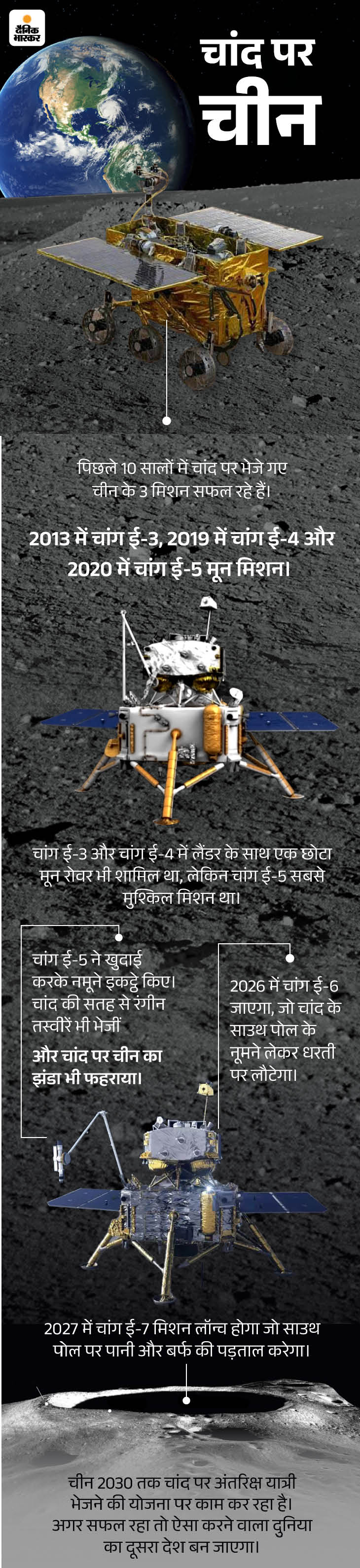 2020 में चीन का चांग’ई-5 भी चांद से 1.7 किलो सैंपल लेकर लौटा था। हालांकि, ये सैंपल चांद के पास के इलाके ओशिएनस प्रोसेलेरम से लिए गए थे। चीन 3 और मून मिशन्स की तैयारी में है। इनके जरिए चांद पर पानी की खोज होगी और परमानेंट बेस बनाया जाएगा।