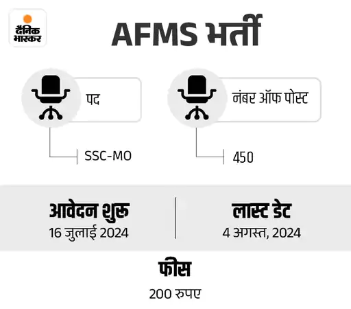सेना ने सशस्त्र बल चिकित्सा सेवा (AFMS) के तहत 450 शॉर्ट सर्विस कमीशन मेडिकल ऑफिसर (SSC-MO) के पदों पर भर्ती निकाली है। उम्मीदवार भारतीय सेना की ऑफिशियल वेबसाइट amcsscentry.gov.in पर जाकर आवेदन कर सकते हैं।