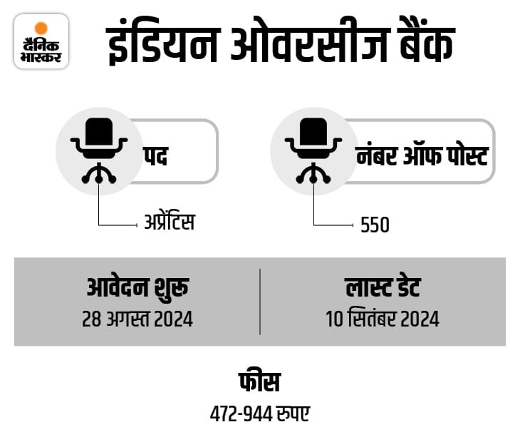 2. इंडियन ओवरसीज बैंक में अप्रेंटिस के 550 पदों पर भर्ती