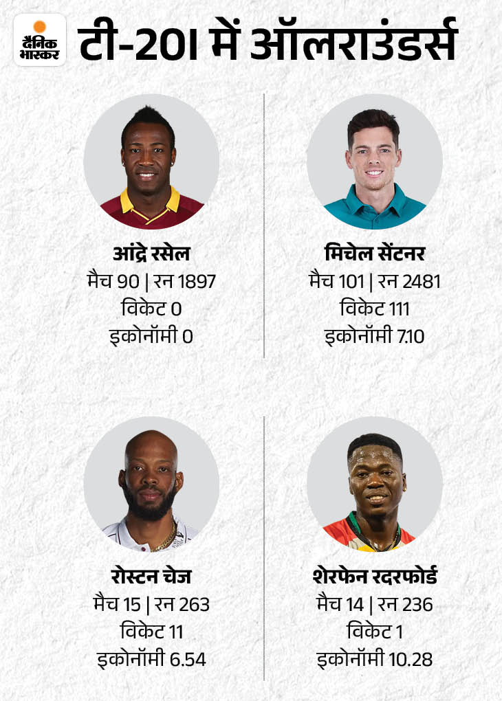 ऑलराउंडर्स के तौर आंद्रे रसेल, मिचेल सेंटनर, रोस्टन चेज, शेरफेन रदरफोर्ड को चुन सकते हैं।