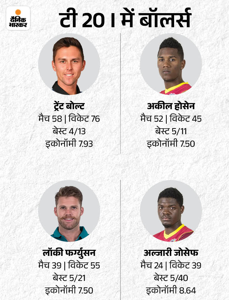 बॉलर्स के तौर पर ट्रेंट बोल्ट, अकील होसेने, लॉकी फर्ग्युसन और अल्जारी जोसेफ को टीम में शामिल कर सकते हैं।