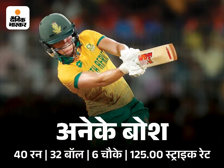 113 रन के स्कोर पर साउथ अफ्रीका ने 3 विकेट गंवा दिए। यहां से अनेके बोश ने एक एंड संभाल लिया। उनके सामने क्लो ट्रायन 12 और नदिन डी क्लर्क 14 रन बनाकर आउट हुईं। 19वें ओवर की आखिरी बॉल पर बोश भी 40 रन बनाकर पवेलियन लौट गईं। उन्होंने टीम का स्कोर 160 रन के पार पहुंचाया।