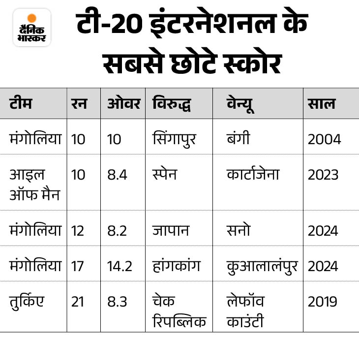 मंगोलियाई टीम सिंगापुर के खिलाफ 10 रन पर ऑलआउट हो गई है। यह टी-20 इंटरनेशनल का जॉइंट लोएस्ट स्कोर है। पिछले साल आइल ऑफ मैन की टीम भी इसी स्कोर पर ऑलआउट हो चुकी है।