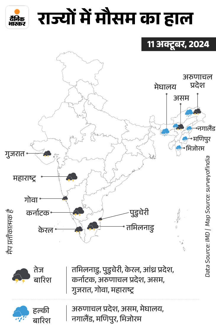 12 और 13 अक्टूबर: केरल और तमिलनाडु में भारी बारिश का अनुमान जताया गया है। साथ ही गोवा, गुजरात और अंडमान और निकोबार द्वीप समूह में बारिश का अलर्ट है।
