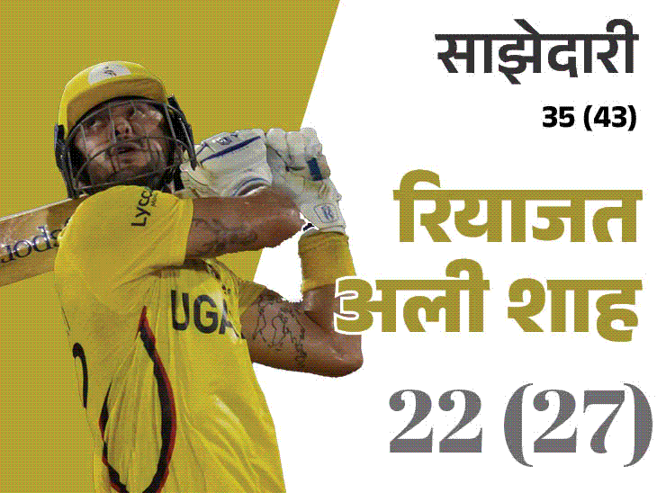 रियाजत अली शाह ने 35 रन की मैच विनिंग पारी खेली। वहीं, जुमा मियागी ने 14 रन बनाए। वहीं, युगांडा की ओर से अल्पेश रामजानी, जुमा मियागी, कॉसमास क्यवुता और फ्रैंक न्सुबुगा को 2-2 विकेट मिले।