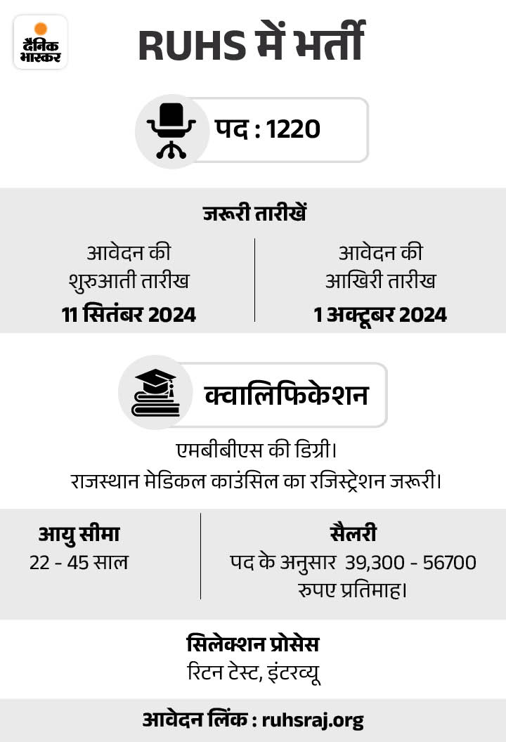 सरकारी नौकरी: राजस्थान स्वास्थ्य विज्ञान यूनिवर्सिटी में 1220 पदों पर निकली भर्ती, एज लिमिट 45 वर्ष, सैलरी 55 हजार से ज्यादा
