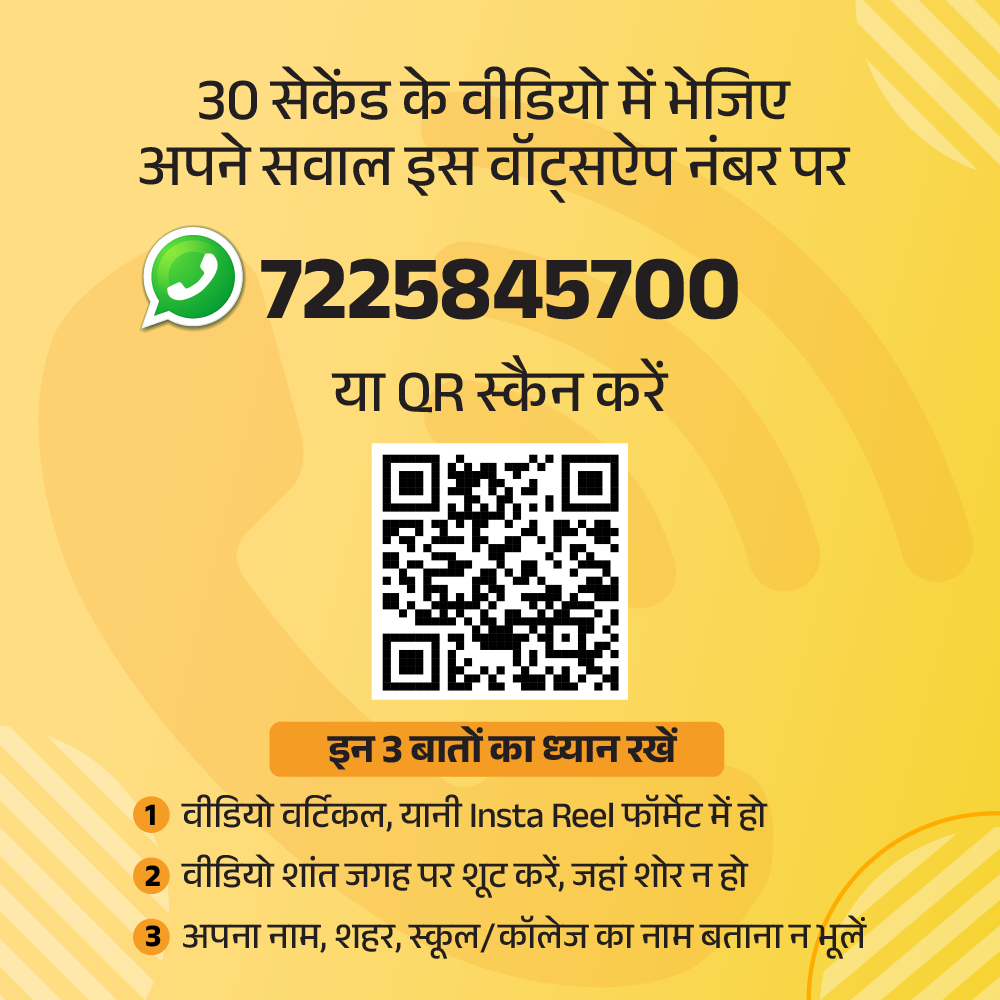 तो उठाइए मोबाइल, अपना सवाल 30 सेकेंड के वीडियो में रिकॉर्ड कीजिए और हमें भेज दीजिए 7225845700 पर। देश के एक्सपर्ट करियर काउंसलर्स देंगे आपके सवालों के जवाब।