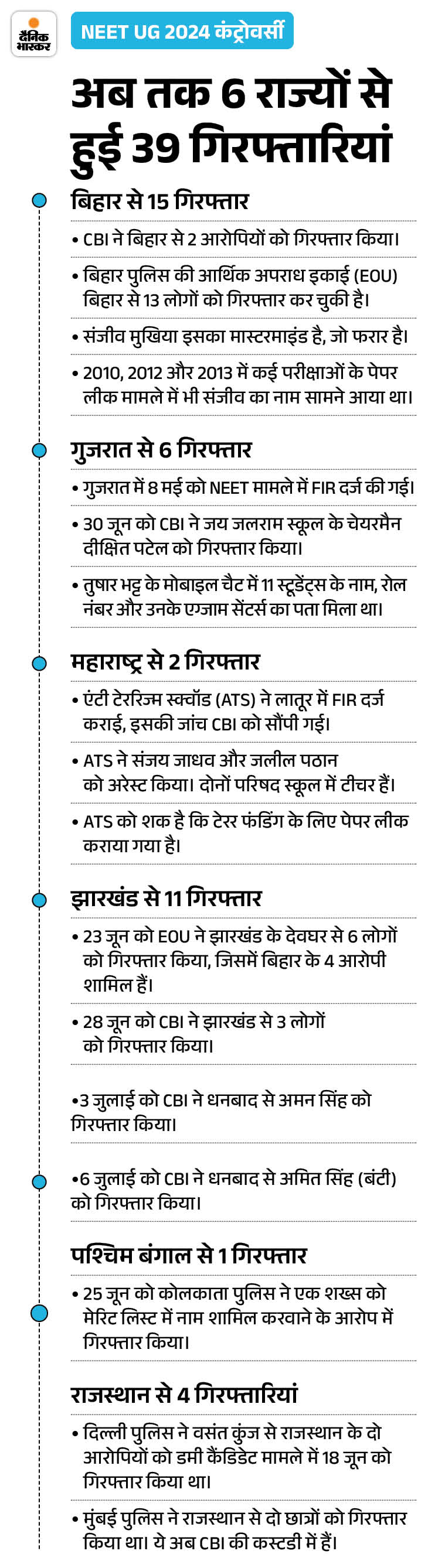 बिहार पुलिस ने पेपर लीक के शक में 5 मई को ही 13 लोगों को गिरफ्तार कर लिया था। हालांकि, नेशनल टेस्टिंग एजेंसी (NTA) ने एग्जाम के एक दिन बाद यानी 6 मई को पेपर लीक के आरोप से इनकार कर दिया था।