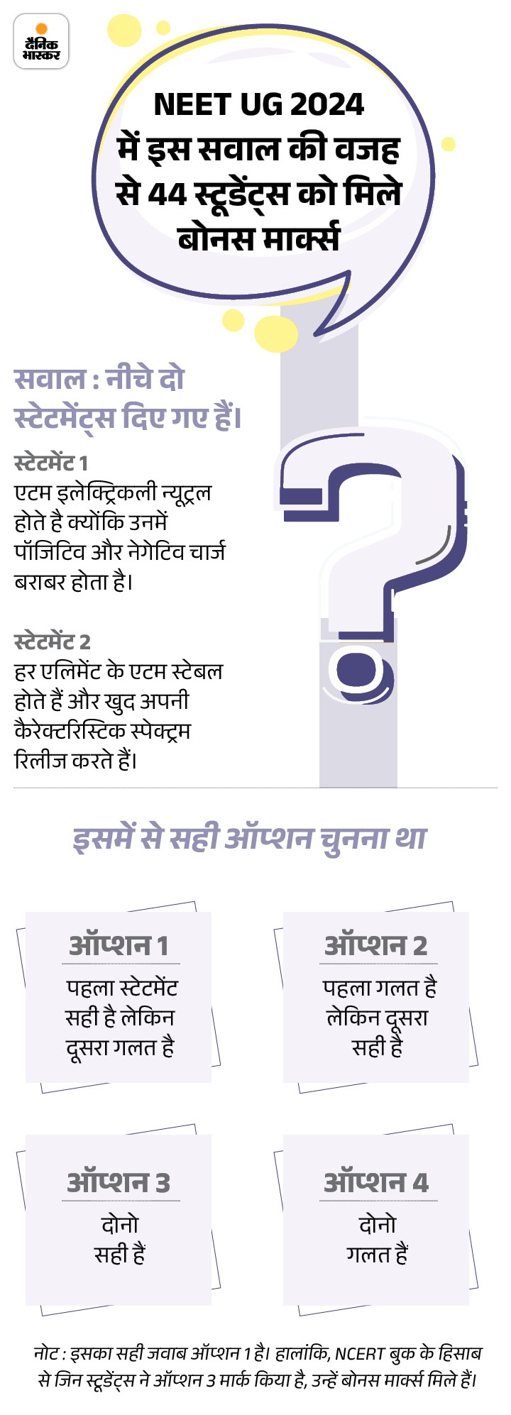 सुप्रीम कोर्ट ने 22 जुलाई को एग्जाम में एक विवादित सवाल के 2 सही ऑप्शन वाले क्वेश्चन की पड़ताल का आदेश दिया। कोर्ट ने कहा कि 2 सही ऑप्शन देने से 44 स्टूडेंट्स को बोनस मार्क्स मिले और 4.2 लाख कैंडिडेट्स को नुकसान हुआ है। इस पर IIT दिल्ली के एक्सपर्ट्स की राय लें।