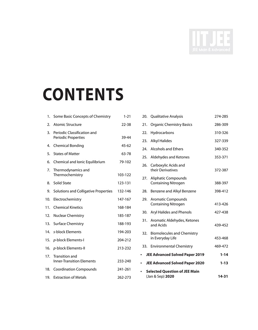 Some Basic Concepts of Chemistry, Atomic Structure, Periodic Classification and Periodic Properties, Chemical Bonding, States of Matter, Chemical and Ionic Equilibrium, Thermodynamics and Thermochemistry, Solid State, Solutions and Colligative Properties, Electrochemistry, Chemical Kinetics, Nuclear Chemistry, Surface Chemistry, s-block Elements, p-block Elements-I, p-block Elements-II, Transition and Inner-Transition Elements, Coordination Compounds, Extraction of Metals, Qualitative Analysis, Organic Chemistry Basics, Hydrocarbons, Alkyl Halides, Alcohols and Ethers, Aldehydes and Ketones, Carboxylic Acids and their Derivatives, Aliphatic Compounds Containing Nitrogen, Benzene and Alkyl Benzene, Aromatic Compounds Containing Nitrogen, Aryl Halides and Phenols, Aromatic Aldehydes, Ketones and Acids, Biomolecules and Chemistry in Everyday Life, Environmental Chemistry, JEE Advanced Solved Paper 2019, JEE Advanced Solved Paper 2020, Selected Question of JEE Main (Jan & Sep) 2020.”