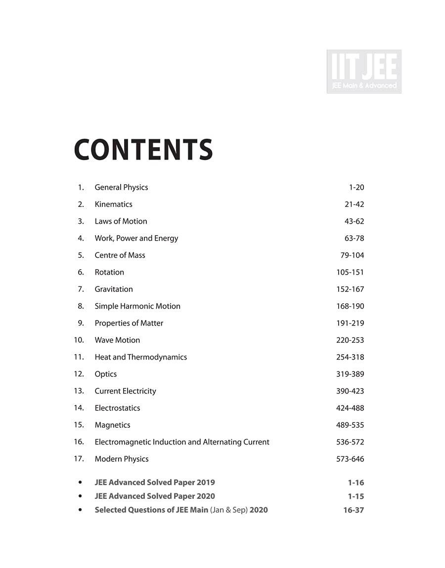 General Physics, Kinematics, Laws of Motion, Work, Power and Energy, Centre of Mass, Rotation, Gravitation, Simple Harmonic Motion, Properties of Matter, Wave Motion, Heat and Thermodynamics, Optics, Current Electricity, Electrostatics, Magnetics, Electromagnetic Induction and Alternating Current, Modern Physics, JEE Advanced Solved Paper 2019, JEE Advanced Solved Paper 2020, Selected Question of JEE Main (Jan & Sep) 2020.”