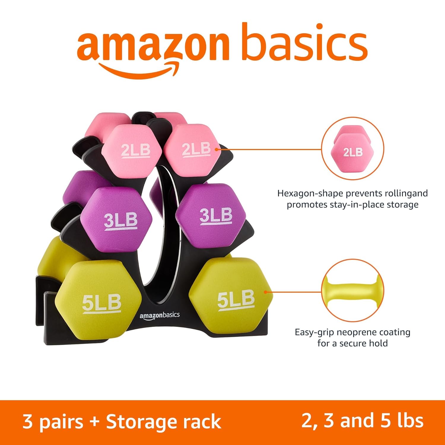 Details 3 pairs of dumbbells in 2-pound, 3-pound, and 5-pound sizes Ideal for resistance training Neoprene coating for a secure grip and indoor/outdoor use Color coordinated for quick identification Easy-to-assemble weight stand included