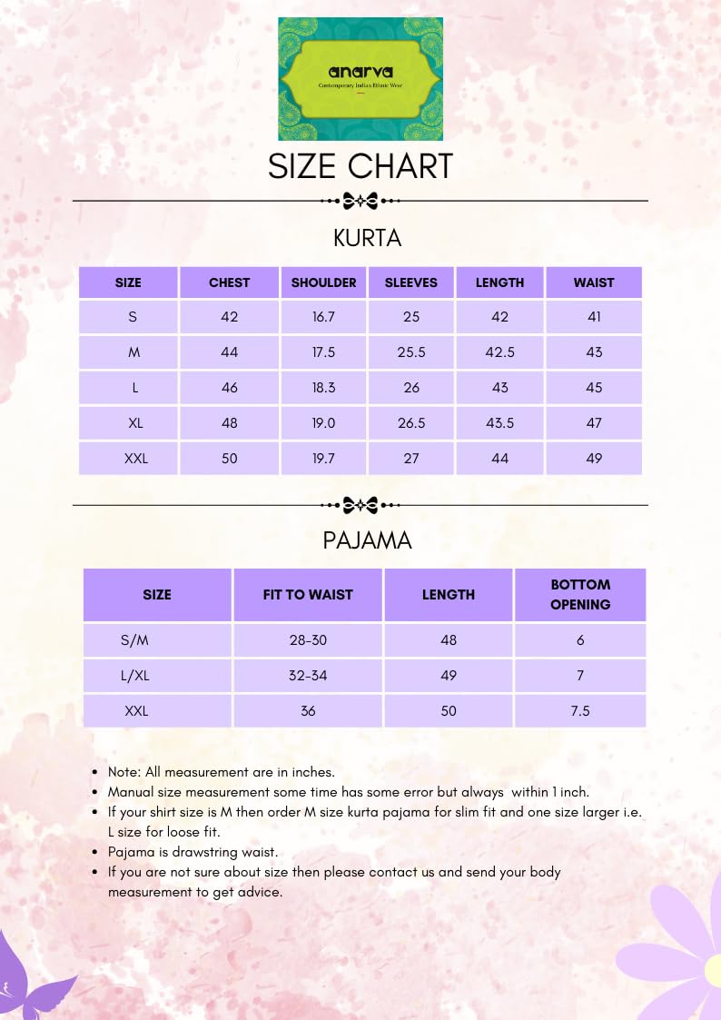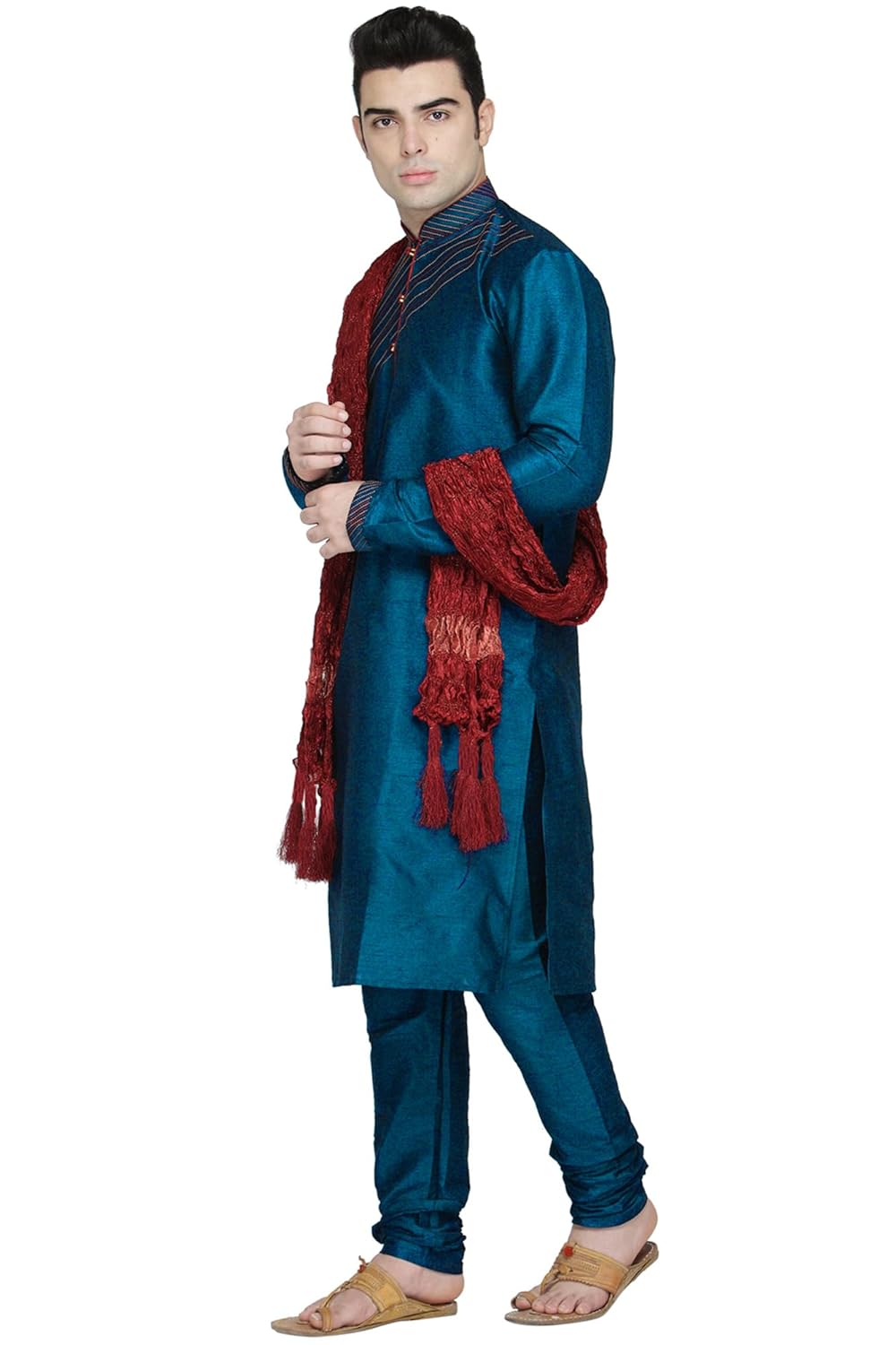 This 3-pieces Kurta pajama set in art silk fabric includes a kurta, pajama and scarf. Using art silk, our kurta tunic set brings together quality and style into one simple piece. A completely traditional Indian design, this kurta pajama set is handmade from the absolute finest of art silk and feels as light as air to treat you to stylish luxury with each and every wear.Like traditional kurta worn in India, this kurta pajama set includes both a top and a bottom. A round collar neck keeps your chest cool. There is beautiful embroidery around the collar, sleeves and placket. Loose fitting sleeves and slits along the sides allow for an easy fit and let air circulate freely through the garment. The pant included in this kurta pajama set has a relaxed fit through the seat and legs for absolute comfort. Loose comfortable fitting makes it a great wear. This kurta pajama set is worn in both summer and winter. Comes with complimentary free size trouser (pajama) with drawstring in waist.