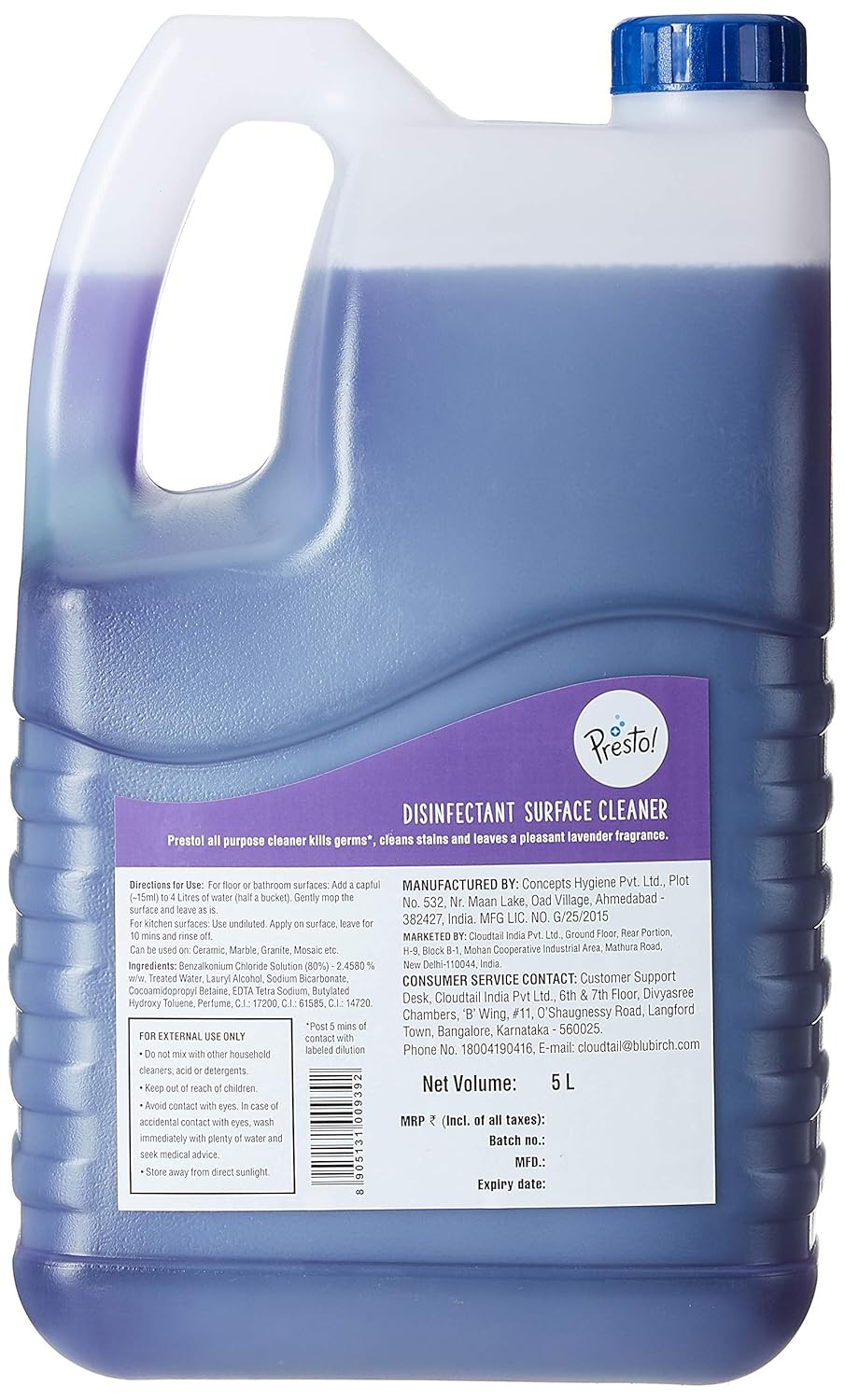 Amazon Brand – Presto! Disinfectant Surface & Floor Cleaner Liquid | Lavendar | 5 Litre | 1 Can | Kills 99.9% Germs | Removes Stains | Safe on Hands