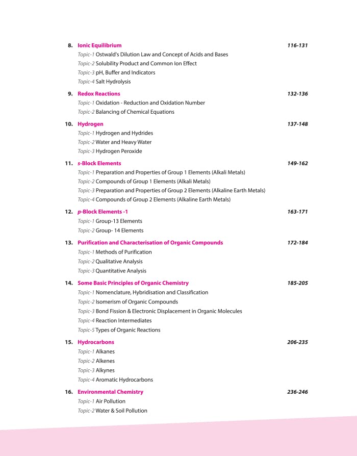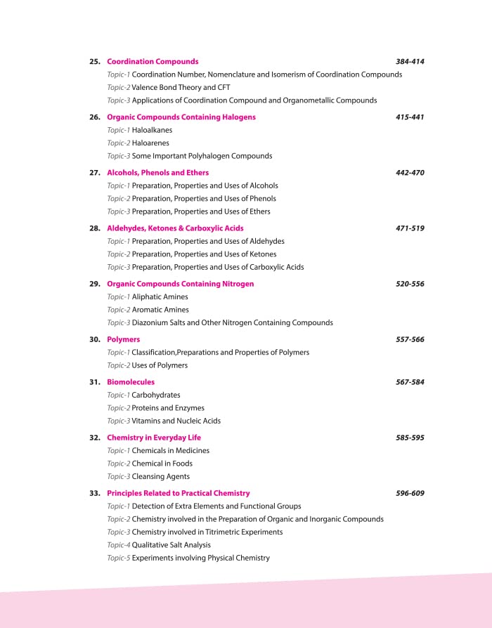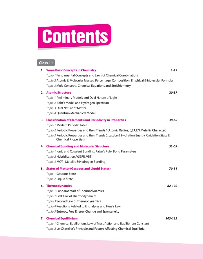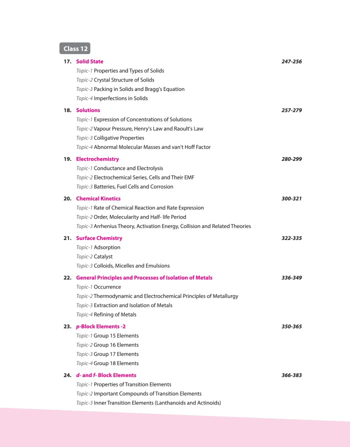 Class 11: Some Basic Concepts in Chemistry, Atomic Structure, Classification of Elements and Periodicity in Property, Chemical Bonding and Molecular Structure, States of Matter, Thermodynamics, Chemical Equilibrium, Ionic Equilibrium, Redox Reactions, Hydrogen, s-Block Elements, p-Block Elements-1, Purification and Characterisation of Organic Compounds, Some Basic Principles of Organic Chemistry, Hydrocarbons, Environmental Chemistry, Class 12: Solid State, Solutions, Electrochemistry, Chemical Kinetics, Surface Chemistry, General Principles and Processes of Isolation of Metals, p- Block Elements-2, d-and f-Block Elements, Coordination Compounds, Organic Compounds containing Halogens, Alcohols, Phenols and Ethers, Aldehydes, Ketones & Carboxylic Acid, Organic Compounds Containing Nitrogen, Polymers, Biomolecules, Chemistry in Everyday Life, Principles Related to Practical Chemistry