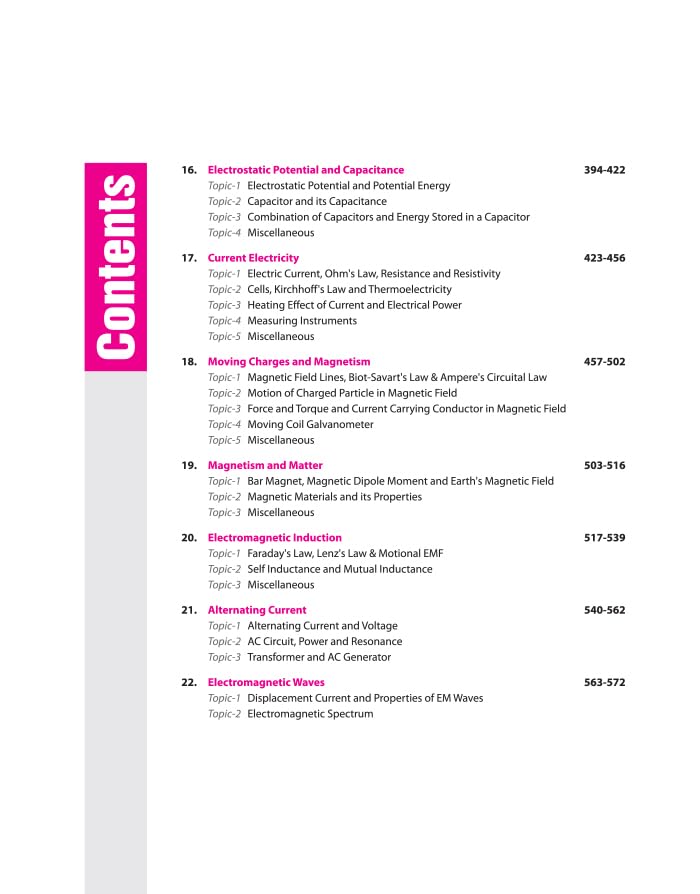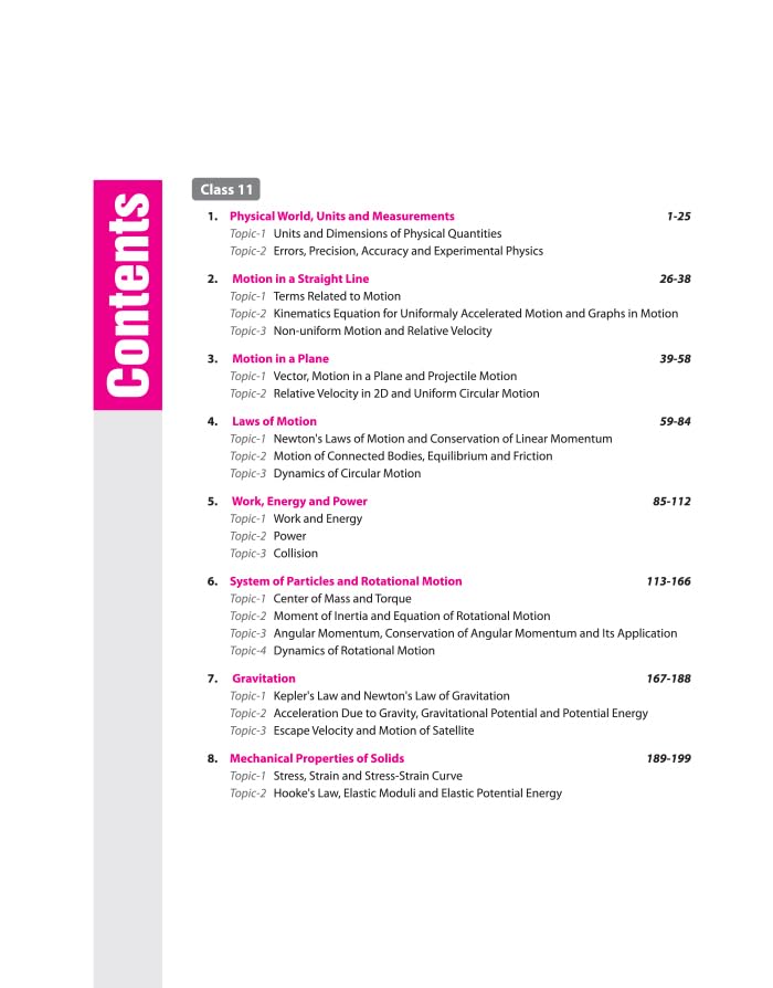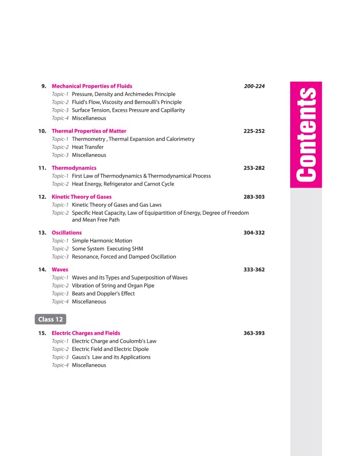 Class 11- Physical World, Units and Measurements, Motion in a straight line, Motion in a Plane, Laws of Motion, Work, Energy and Power, System of Particles and Rotational Motion, Gravitation, Mechanical Properties of Solids, Mechanical Properties of Fluids, Thermal Properties of Matter, Thermodynamics, Kinetics Theory of Gases, Oscillations, Waves, Class 12- Electric Charges and Fields, Electrostatic Potential and Capacitance, Current Electricity, Moving Charges and Magnetism, Magnetism and Matter, Electromagnetic Induction, Alternating Current, Electromagnetic Waves, Ray Optics and Optical Instruments, Wave Optics, Dual Nature of Radiation and Matter, Atoms, Nuclei, Semiconductor Electronics: Materials, Devices & Simple Circuits, Communication System