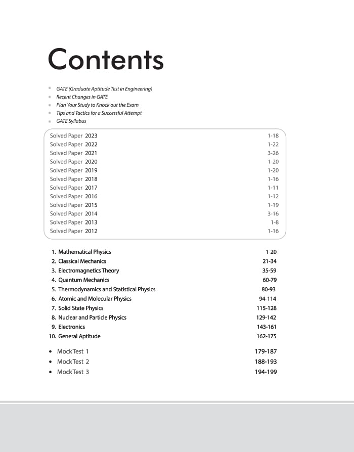 Solved Papers (2023-2012), Mathematical Physics, Classical Mechanics, Electromagnetics Theory, Quantum Mechanics, Thermodynamics and Statistical Physics, Atomic and Molecular Physics, Solid State Physics, Nuclear and Particle Physics, Electronics, General Aptitude, Mock Tests (1-3)