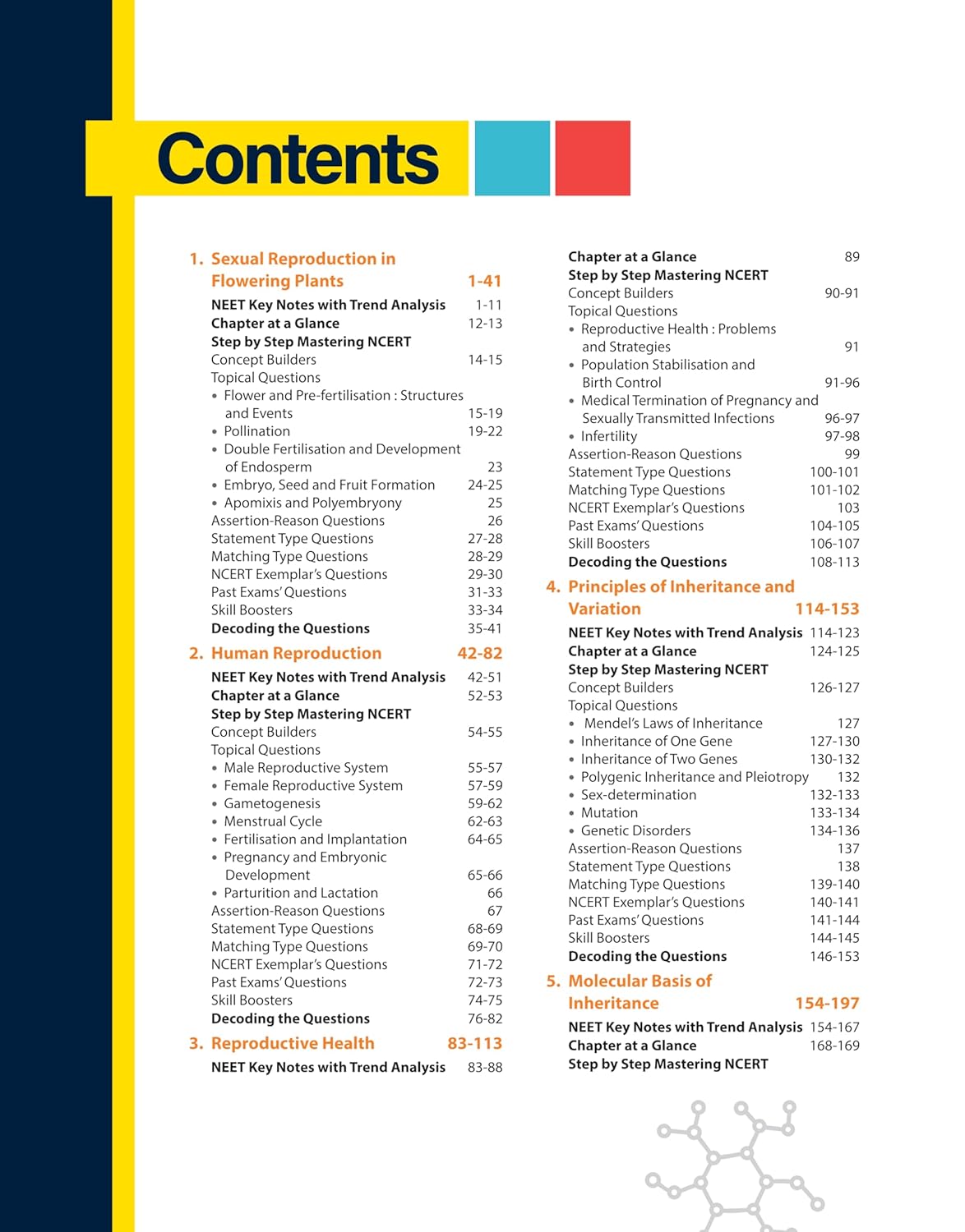 3 Level Chapter Analysis is incorporated in the beginning of each chapterNEET Key Notes with NEET exclusive features like NEET PYQ Markings, Marks Maximizer, Mnemonics & PYQ NotesBiology through diagrams is present as figure explanatory videosFully colored concept maps in “Chapter at a Glance” for effective revisionStep-by-step mastering through multitudinal MCQs as Concept Builders, Topical, Assertion-Reason, Statement Based, Matching, NCERT Exemplar’s, Past Exams’ and Skill BoostersQuestions of all exercises are tagged with NCERT page numbersMCQs based online Chapter Tests and 3 online Mock Tests for self-assessmentAnswers & Explanatory solutions at the end of the chapter under “decoding the questions” section