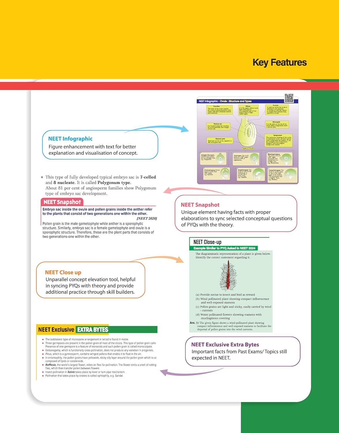 Modular Theory and PracticeEach chapter begins with:Learning Objectives- Glimpse of Modular Distribution of TopicsChapter Overview with NEET Connection- Contains chapter abstract, insight of important topics, suggestions to grip the chapter in a better way, NEET analytics as video supportChapters divided into smaller modulesEach module theory is featured withConcept Ladder- Focused box matter with enhanced and important information about the conceptMentor’s Tips- Specialised tips, tricks, and advices by mentorNEET Info Graphics- Figure enhancement with text for better explanationModular theory is synced with PYQs throughNEET Snapshot- Selected conceptual questions of PYQs with fully explained theory having factsNEET Close Up- Example similar to PYQ asked in NEET 2024 along with additional practice through skill buildersNEET Exclusive Extra Bytes- Important facts from past exams/ topics still expected in NEETAssignment of the chapters are given withStep up Practice- Scientifically designed first practice exercise to check modular learningGearing up for NEET- Mixed bag of assorted MCQs with all special format questions types asked in NEETFinal Check through PYQs- Specialised PYQs section having last 10 years PYQs arranged in modular formatThe explanation of all questions is given at the chapter end as hints and solutions3 Practice sets to self analyse the preparation level