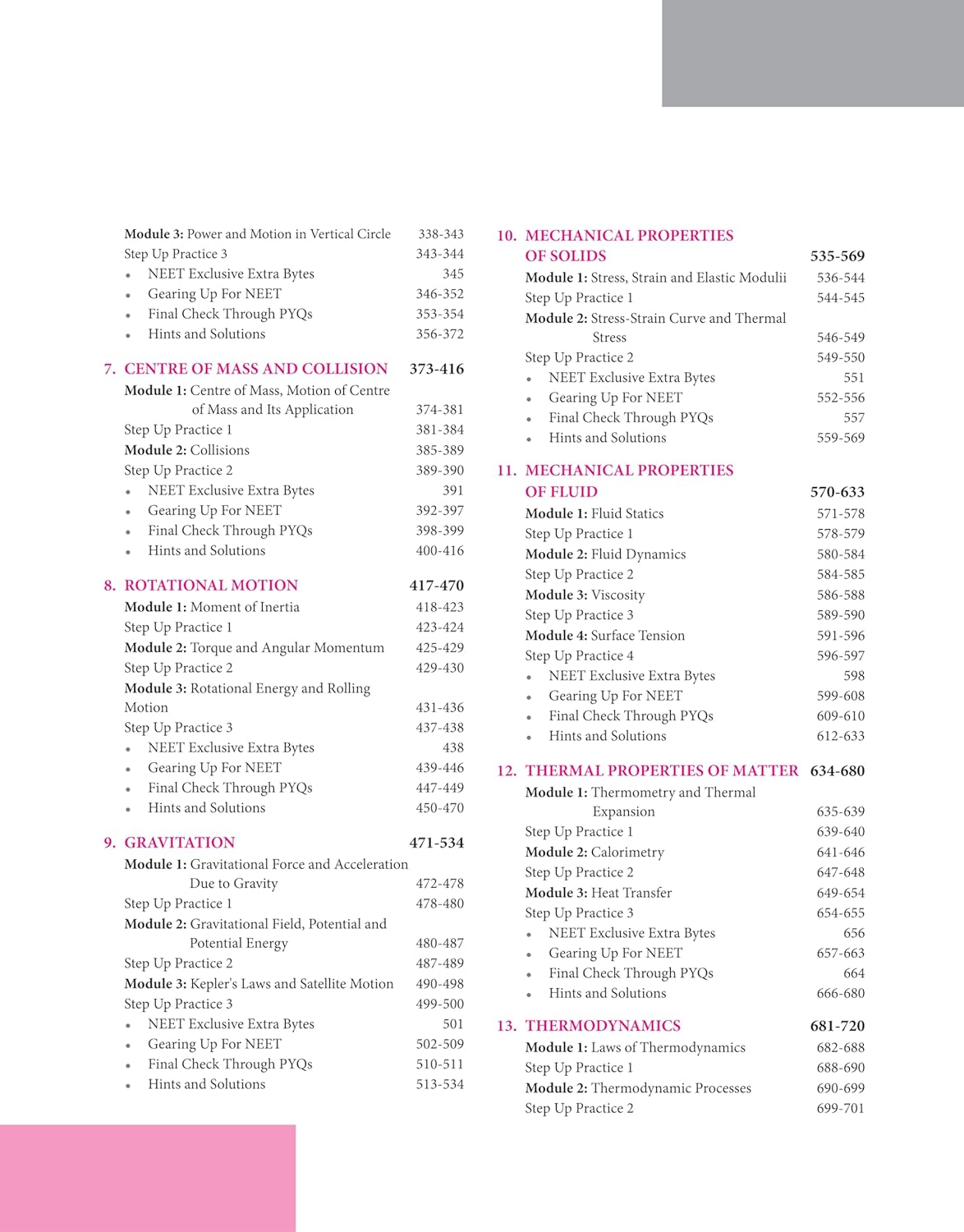 Mathematical tools in Physics, Units, Dimensions, & Error Analysis, Vectors, Motion in a Straight Line, Motion in a Plane, Laws of Motion, Work, Energy, and Power, Centre of Mass and Collision, Rotational Motion, Gravitation, Mechanical Properties of Solids, Mechanical Properties of Fluid, Thermal Properties of Matter, Thermodynamics, Kinetic Theory of Gases, Simple Harmonic Motion, Wave Motion, Practice Sets (1-2)