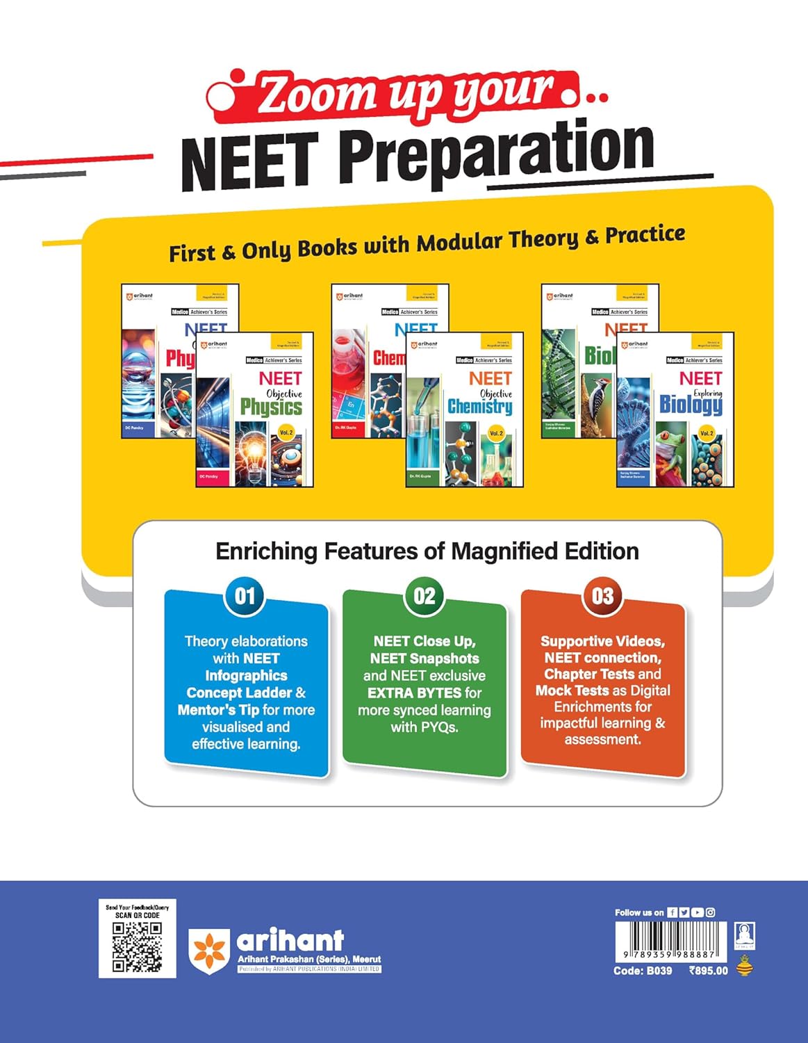Modular Theory and PracticeEach chapter begins with:Learning Objectives- Glimpse of Modular Distribution of TopicsChapter Overview with NEET Connection- Contains chapter abstract, insight of important topics, suggestions to grip the chapter in a better way, NEET analytics as video supportChapters divided into smaller modulesEach module theory is featured withConcept Ladder- Focused box matter with enhanced and important information about the conceptMentor’s Tips- Specialised tips, tricks, and advices by mentorModular theory is synced with PYQs throughNEET Snapshot- Selected conceptual questions of PYQs with fully explained theory having factsNEET Close Up- Example similar to PYQ asked in NEET 2024 along with additional practice through skill buildersNEET Exclusive Extra Bytes- Important facts from past exams/ topics still expected in NEETAssignment of the chapters are given withStep up Practice- Scientifically designed first practice exercise to check modular learningGearing up for NEET- Mixed bag of assorted MCQs with all special format questions types asked in NEETFinal Check through PYQs- Specialised PYQs section having last 10 years PYQs arranged in modular formatThe explanation of all questions is given at the chapter end as hints and solutions2 Practice sets to self analyse the preparation level