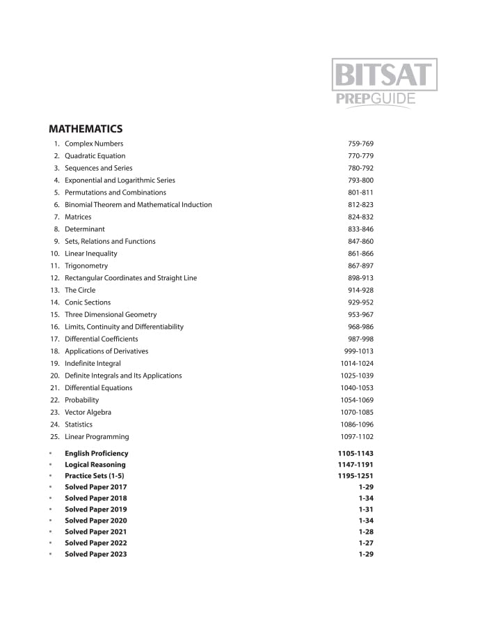 Comprehensive coverage of all the topics of Physics, Chemistry, & MathematicsPrepared according to the nature of questions asked in BITSATIncludes a portion of English Proficiency and Logical Reasoning TestsPrevious Years’ Question Papers from 2017-2023Detailed Solution to each question of PYQ5 Practice Sets for rigorous practice