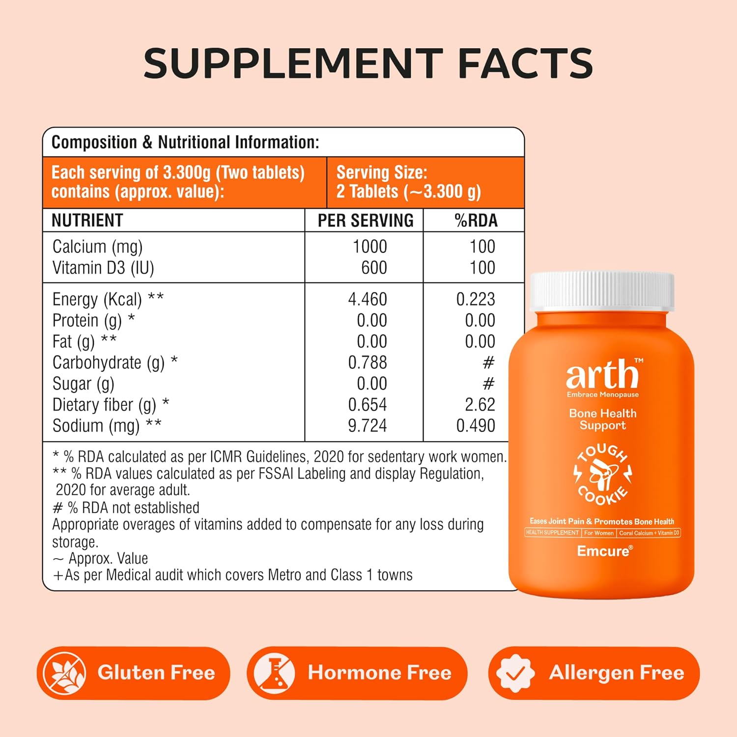 SUPPORT BONE HEALTH: Natural declines in hormones can lead to achy joints and potential loss of bone density. With Arth’s specially formulated bone health supplement for women, you can stay active and continue pursuing your passions. Powered by coral calcium and Vitamin D3 for easy absorption, these tablets not only support bone strength but also act as a joint pain supplement, ensuring your bone health and joint comfort remain uncompromised