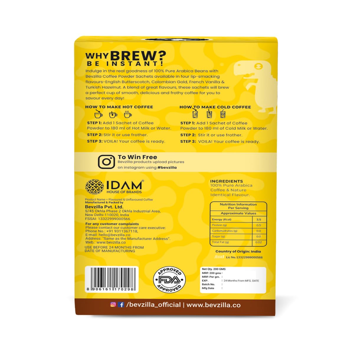 ☕Indulge in the real goodness of 100% Pure Arabica Beans with Bevzilla Coffee Powder Sachets available in four lip-smacking flavours- English Butterscotch, Colombian Gold, French Vanilla & Turkish Hazelnut.