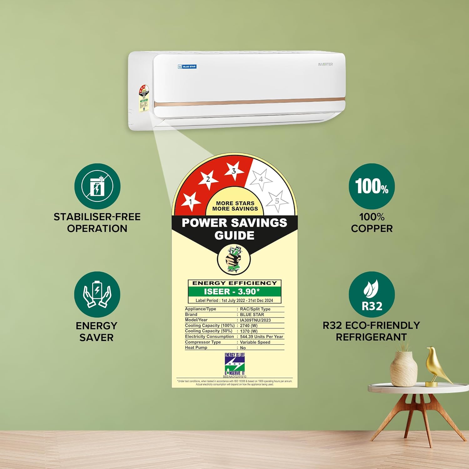 Review: Saves electricity. Consumes power like a desert coller when run on 24 degrees with power saving mode and after cleaning the filters and outer unit weekly. Cools even a big room in an apartment where I have installed it. But it’s actually ment for a small room. In May June it’s cooling affect takes time during the day. But overall bang for the buck. But the filter and the outer unit needs to cleaned nicely for good performance. If you have this AC and your ac is not cooling well you need to clean your ac thoroughly or get the gas checked.