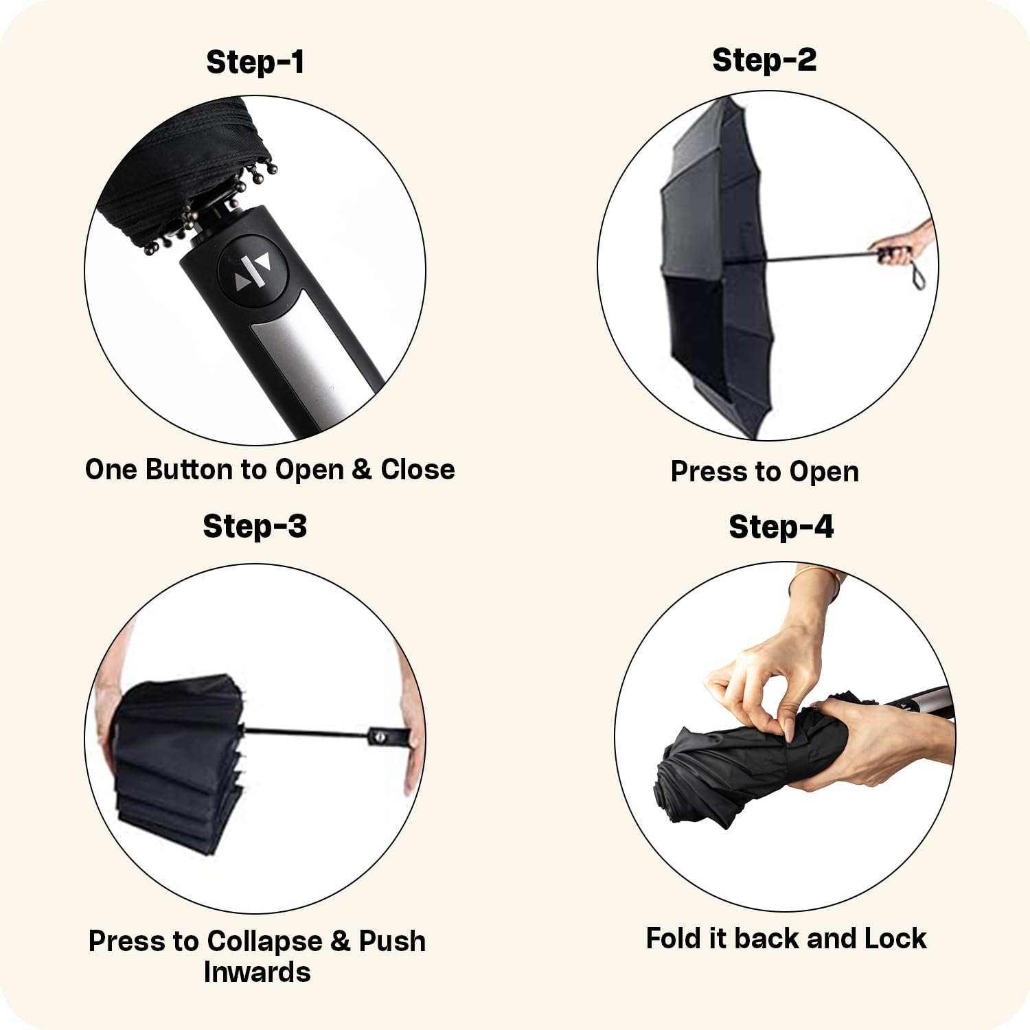 Review: The umbrella is of ok quality..but there are some catches…overall..Pros:Good quality handle.Cloth is soft and of good qualityButton works well everytime.Cons1. The umbrella says uv protection but there is no uv coating under the umbrella, the umbrella cloth is transparent so you might feel some flares. Better buy a silver coated umbrella if you are using umbrella for sun protection.2. When you try to push the umbrella to wind it up after pushing the button for closing..there is a very high resistance. It can hurt older people or women. Its not safe. Also mind for people around you too when you are opening and closing.3. I tried to apply some oil on handle to make it smooth but there is no difference also after putting oil all button signs are erased.So ease of folding is a big no no in this umbrella.I will update if I find some more good or bad in this umbrella.