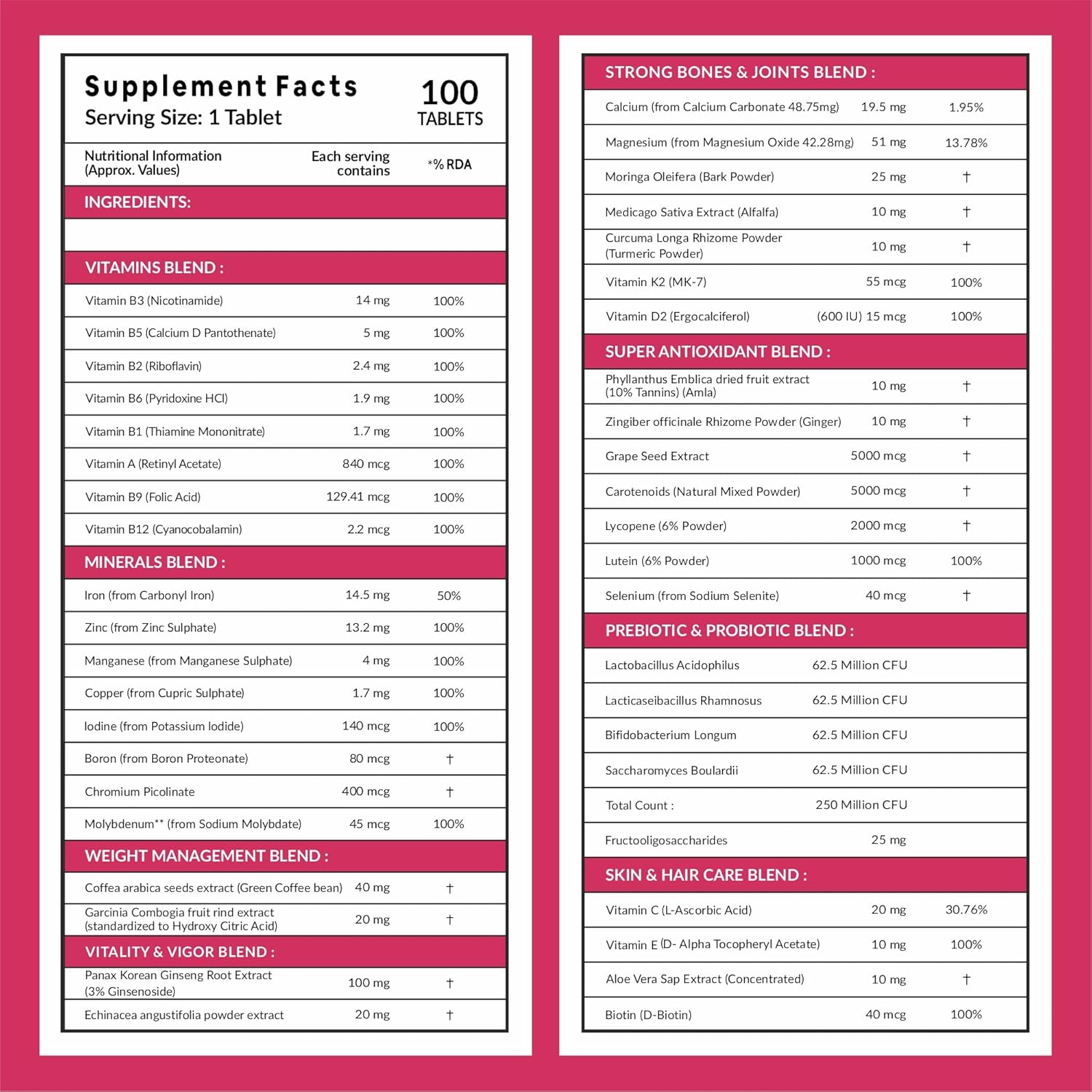 ✅𝟏𝟎𝟎% 𝗥𝗗𝗔 𝗢𝗙 𝗠𝗨𝗟𝗧𝗜𝗩𝗜𝗧𝗔𝗠𝗜𝗡𝗦 & 𝗠𝗨𝗟𝗧𝗜 𝗠𝗜𝗡𝗘𝗥𝗔𝗟𝗦: These women multivitamin Tablets with zinc covers your complete dietary requirements by giving 100% RDA of most of the Essential Vitamins & Minerals.
