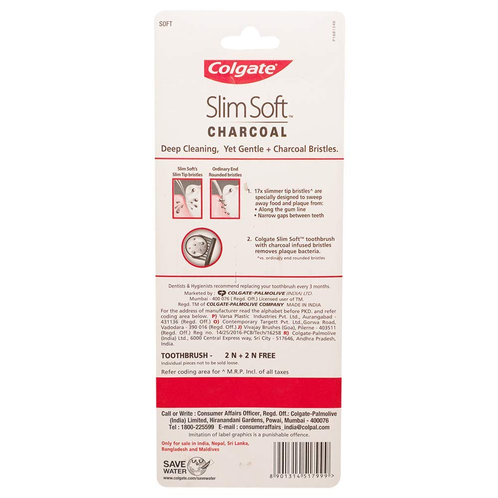 Colgate SlimSoft Charcoal Toothbrush, with 17x slimmer tip bristles vs ordinary end rounded bristles, provides deep yet gentle mouth clean. The slimmer bristle tips help clean in-between teeth and along the gumline. Charcoal –infused bristles sweeps away food and plague, giving you a cleaner mouthfeel with every brush.