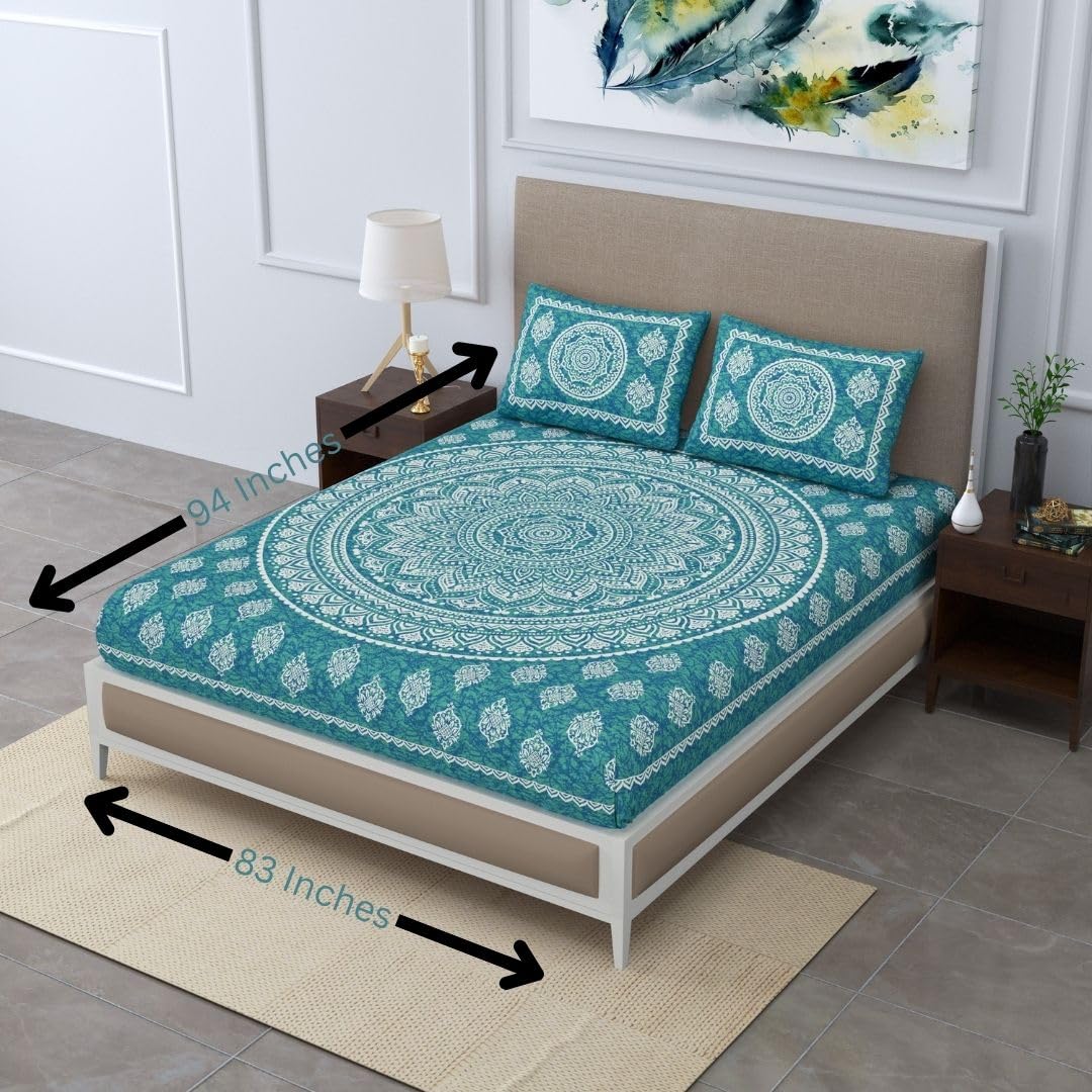 Colorish Cotton Blend Traditional Mandala Jaipuri Printed Bedsheet for Double Bed King Size with 2 Pillow Covers, Sea Green| H603 | 120 TC