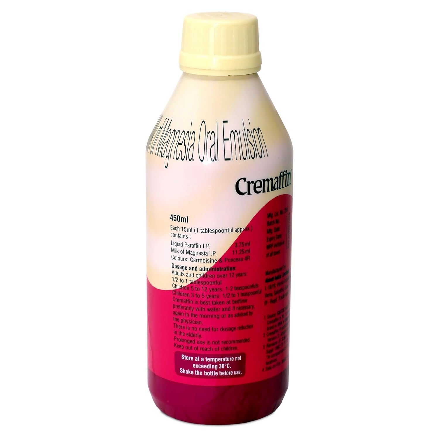 Cremaffin liquid Mixed Fruit flavour provides gentle & effective relief from constipation. It is No.1 Doctor Trusted brand and is combination of 2 laxatives (stool softeners): Milk of Magnesia and liquid paraffin. Milk of magnesia works by drawing water into the intestine through osmosis, while liquid paraffin has lubricant properties which help retain water and fat in the stools. Together, they make the stool soft and slippery making it easier to pass. Cremaffin is Sugar free and available in 225ml & 450ml bottles.