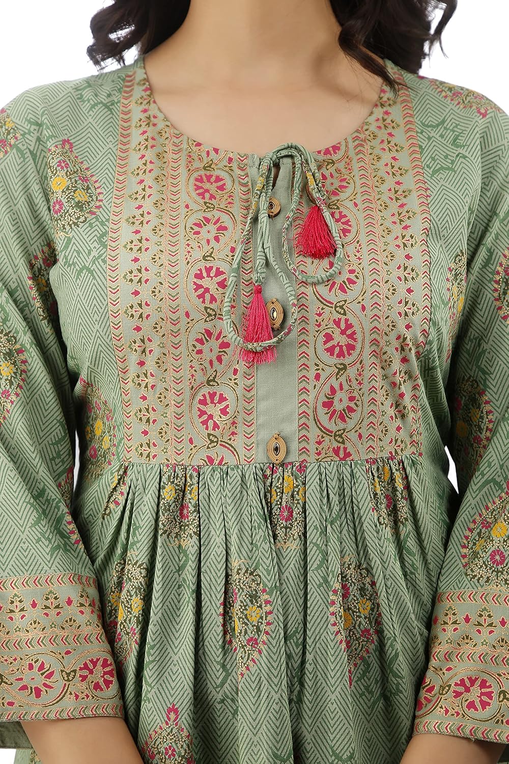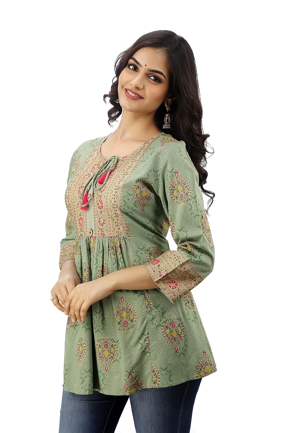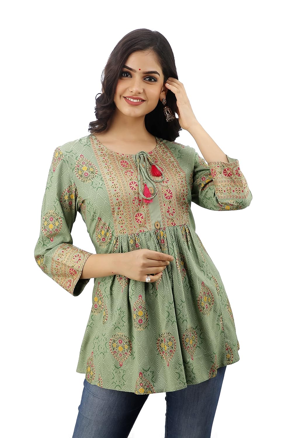 DMP FASHION Women’s Rayon Classy Printed Maroon Top with Beautifull Buttons and Tasseles at Front