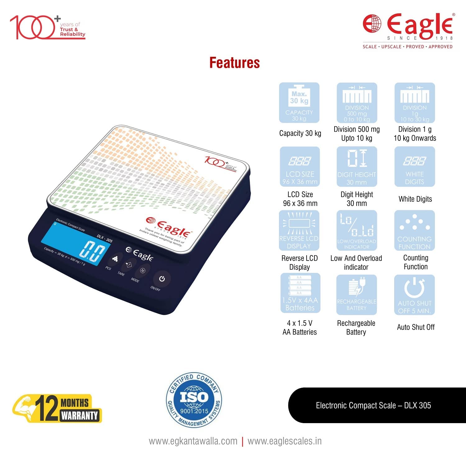 Eagle Weight Machine for Kitchen with 30 kg Capacity, Digital LCD Kitchen Weighing Scale for Shop, Grocery, Office, Pharma, 30MM with USB Cable, Tare Function, 1 Year Warranty (DLX-305)