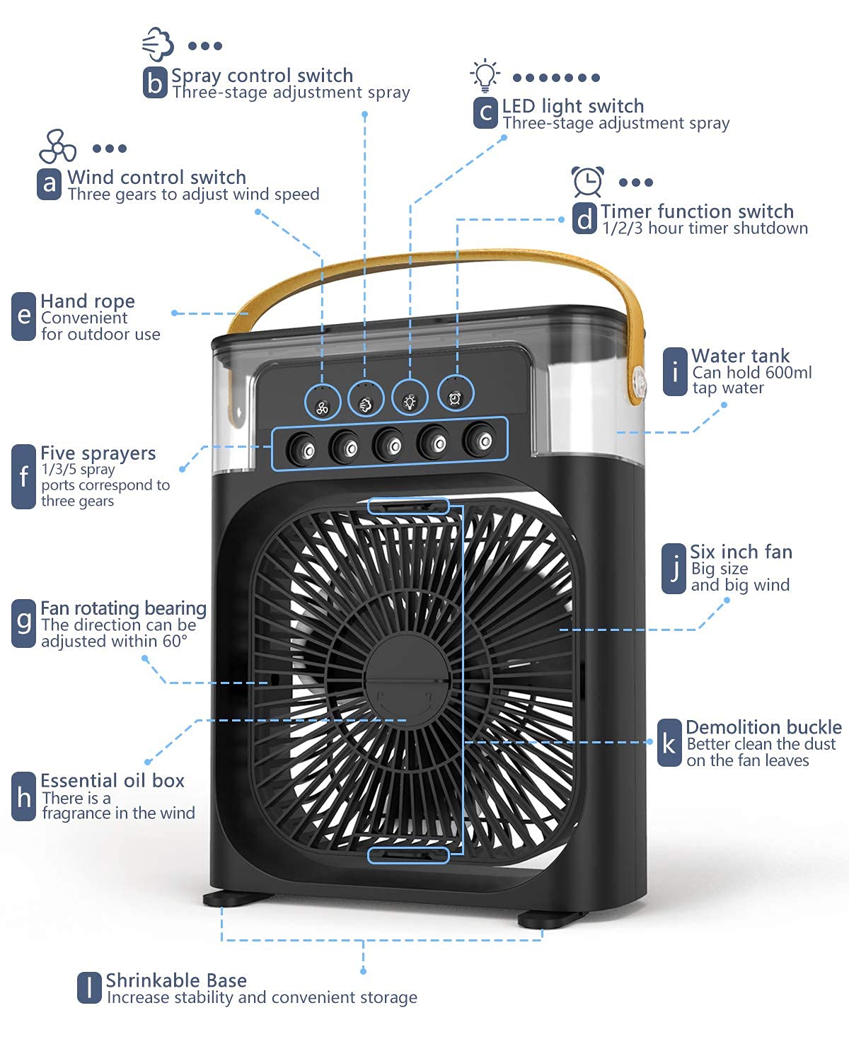 【Three Wind Speeds 】 3 wind speeds (Low-Medium-High) , and a 360° adjustment angle to customize your breeze to stay cool on hot summer days.Aromatherapy tablets can be added,Portable air conditioner is engineered to create powerful airflow using 6-inch oversized fan blades