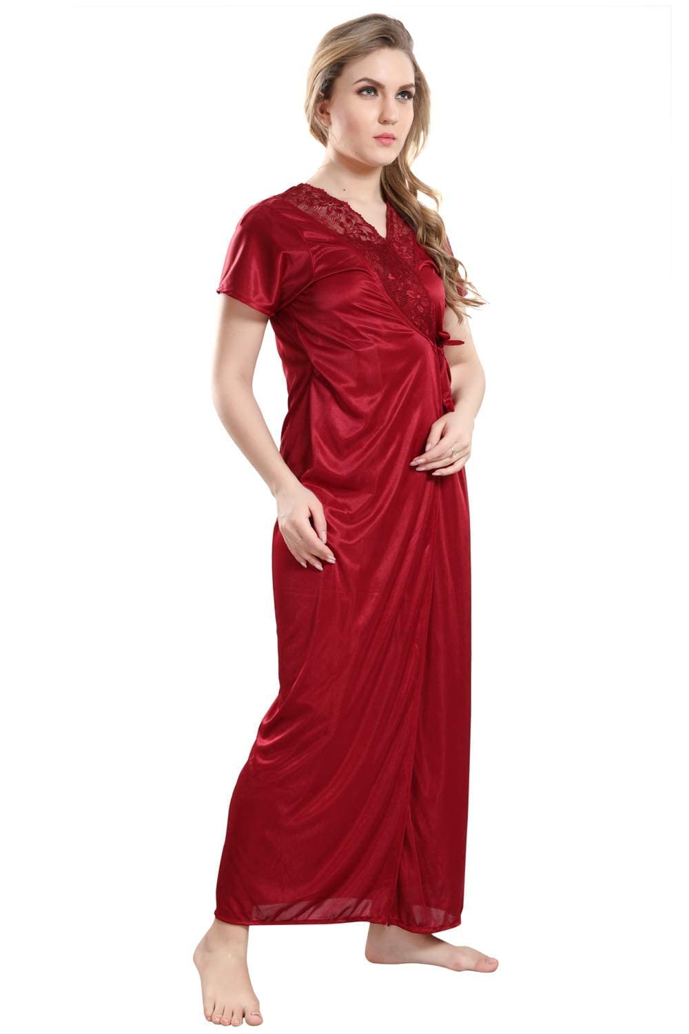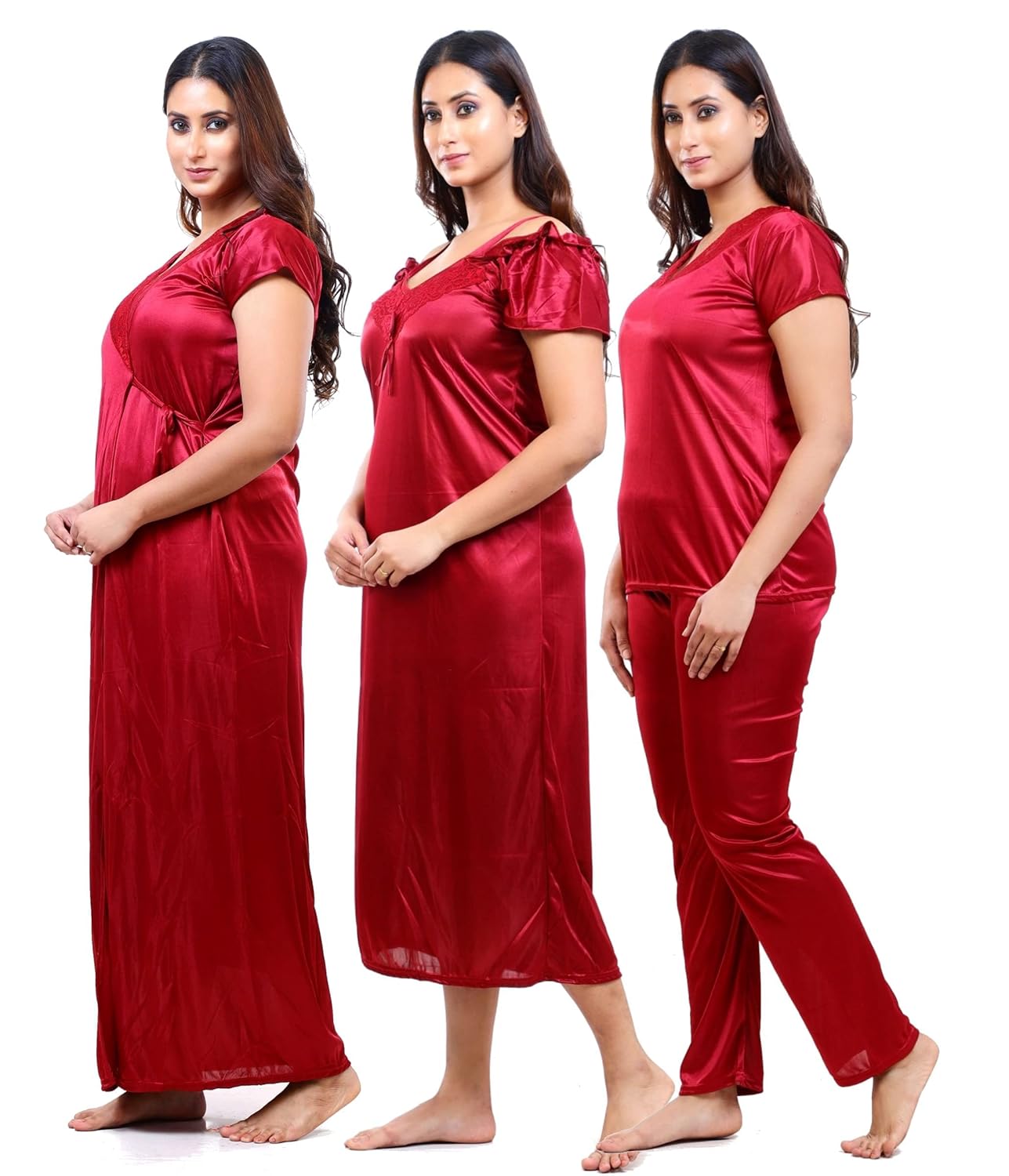 Fabme Women’s four Piece Nighty ( Nighty, Robe, Top, Pyjama) ( Maroon )