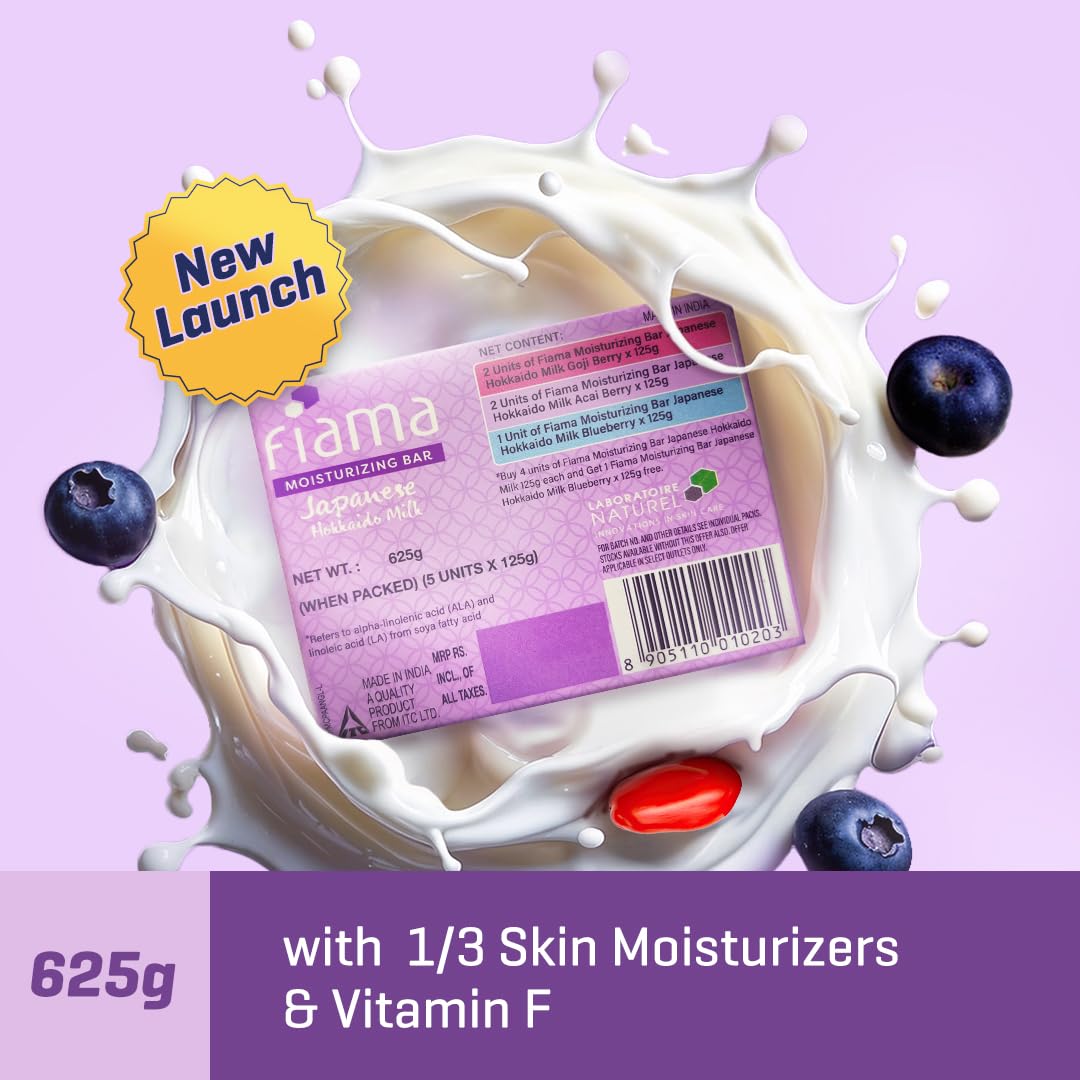 Fiama Moisturizing Soap Bars Celebration Pack, Japanese Hokkaido Milk & Berries, Fiama Soaps Pack of 5, Non-Sticky Moisturized Skin, 1/3rd Skin Moisturizers, Vitamin F, Buy 4 Get 1 Free