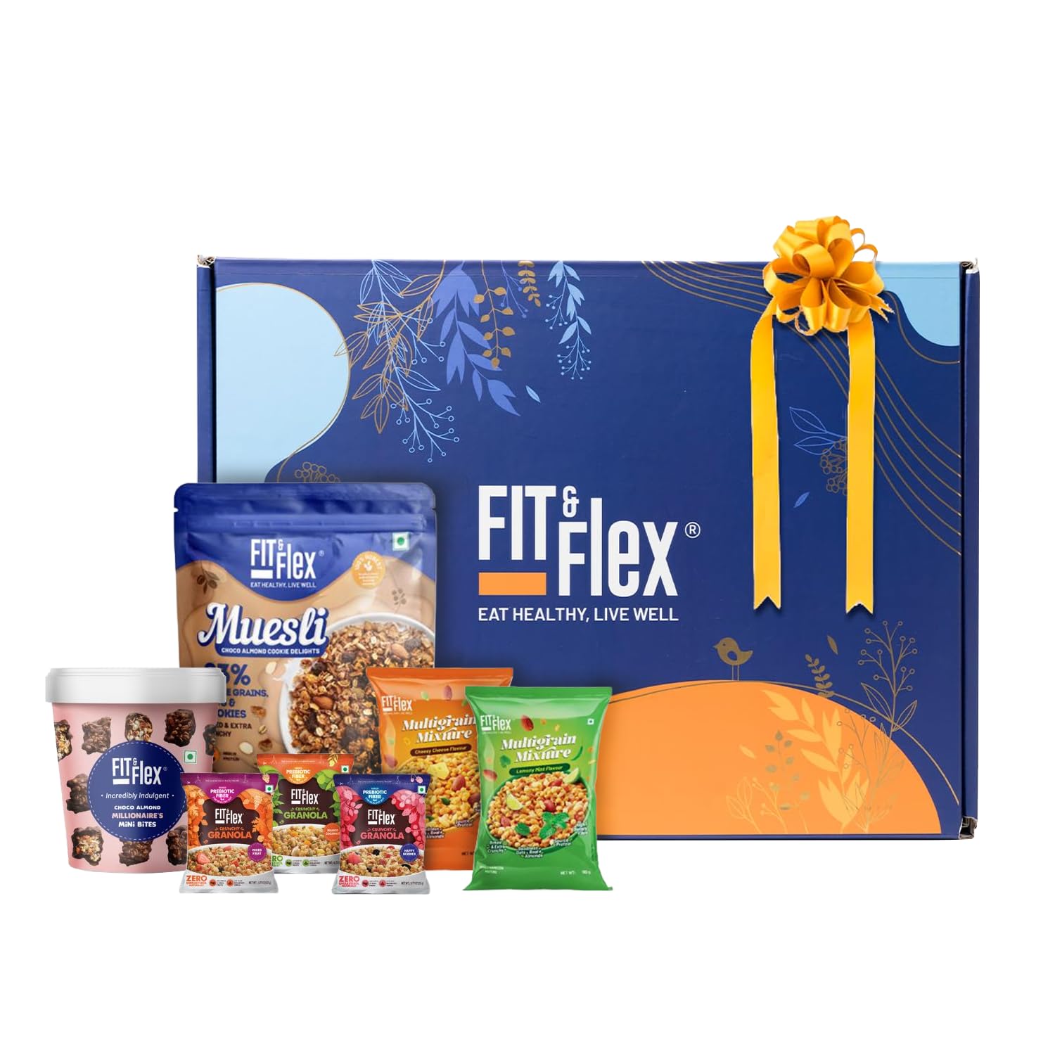 Fit & Flex Healthy Diwali Gift Box Assorted Pack of Premium Snacks (Granola, Muesli, Chocolates & Namkeen) – As Seen on Shark Tank India – Pack of 7