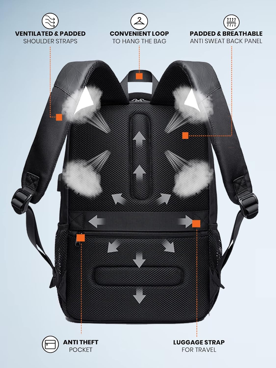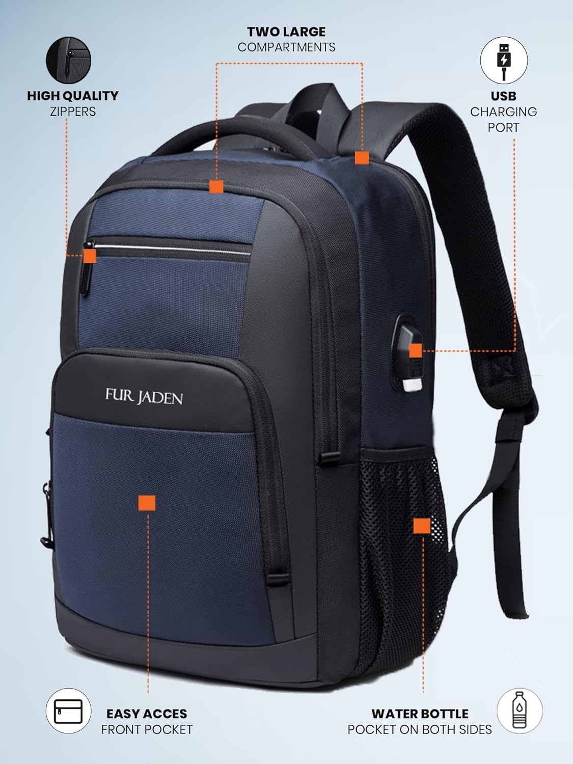Essence: This Fur Jaden smart laptop backpack is for Men and Women who are looking for a voguish, modernistic and branded backpack while having the option to not compromise on quality and be able to carry tons of stuff. Easy Access Pockets: A sleek anti theft pocket on the back as well as 2 pockets on the front side help keep all your belongings comfortably organised. Multi Functional: This Fur Jaden Smart Backpack for men and women comes with a USB Charging Port which offers a convenient way to ensure you never run out of battery on the go. Organizer Pockets in the front compartment help keep al your accessories organized. Padded Laptop compartment helps keep your laptop safe. Ergonomic Design: The backpack features a sleek and ergonomic design with a balanced weight distribution through its straps to reduce the load bearing on your shoulders while the padded ventilated air mesh helps reduce sweat. This makes this bagpack a suitable alternative to bulky and unsightly laptop backpacks. The compact design of this Fur Jaden smart travel bag helps you to rest it comfortably on your shoulders while accommodating all your essentials with ease.
