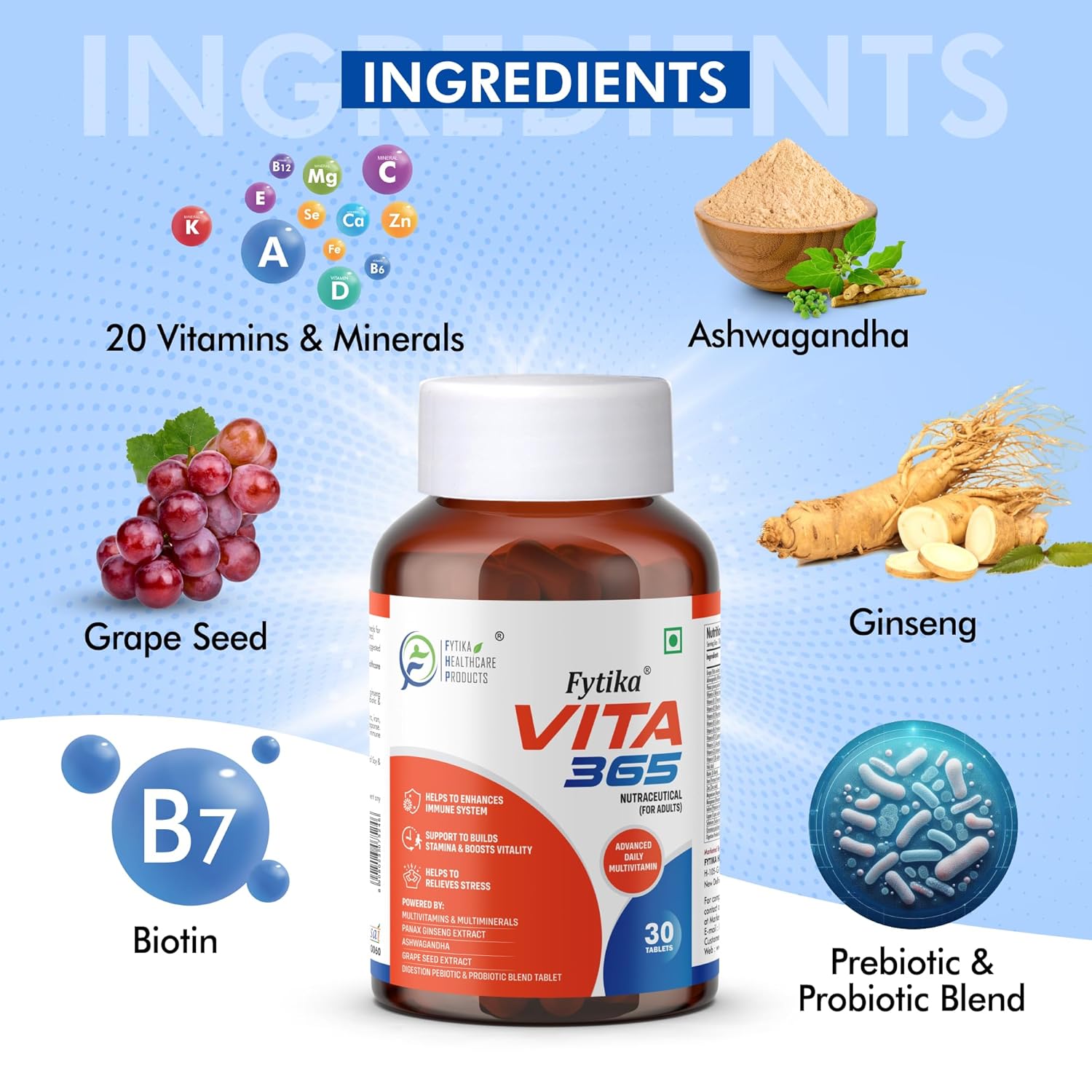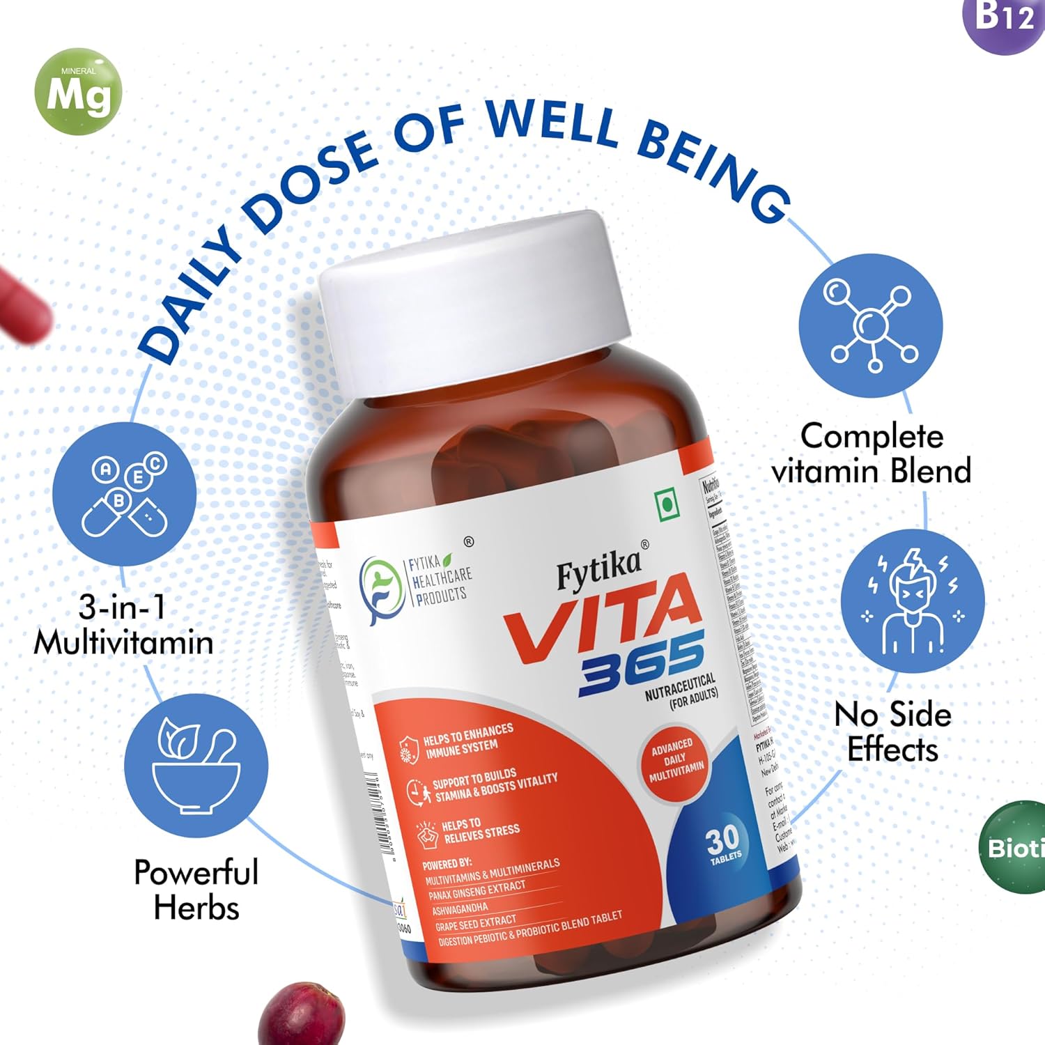 FYTIKA Healthcare Products Vita 365 | Multivitamin For Men And Women | With Ashwagandha, Ginseng, Probiotics & Prebiotics And Biotin| Stamina, Immunity And Digestion| Pack Of 2, 60 Tablets