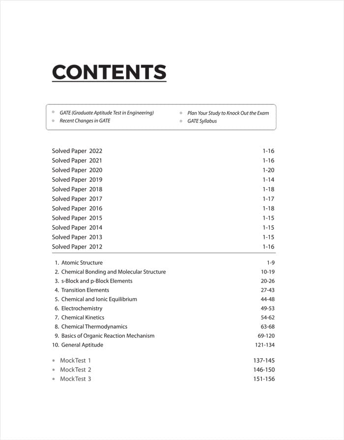 Give a final punch to your preparation with the newly updated edition of ‘GATE Solved & Mock Papers’, which has been carefully curated according to the needs of the exams. As the name suggests, it is a reference manual, with concepts covering the entire syllabus of ‘Chemistry ’, prepared to give insights into the examination pattern and question type. Supported with an ample number of questions, this book also provides practical exposure to the competitors. This book fosters: 1. Complete coverage of the syllabus 2. Chapterwise coverage of questions 3. Designed as per the latest examination pattern 4. 11 Previous Years’ Solved Papers (2022-2012) to give insights 5. 3 Mock Tests for practice 6. Detailed & Authentic Solutions to the questions Table of Contents Solved Paper [2022-2012], Atomic Structure, Chemical Bonding and Molecular Structure, s-Block and p- Block Elements, Transition Elements, Chemical and Ionic Equilibrium, Electrochemistry, Chemical Kinetics, Chemical Thermodynamics, Basics of Organic Reaction Mechanism, General Aptitude, Mock Test [1-3]