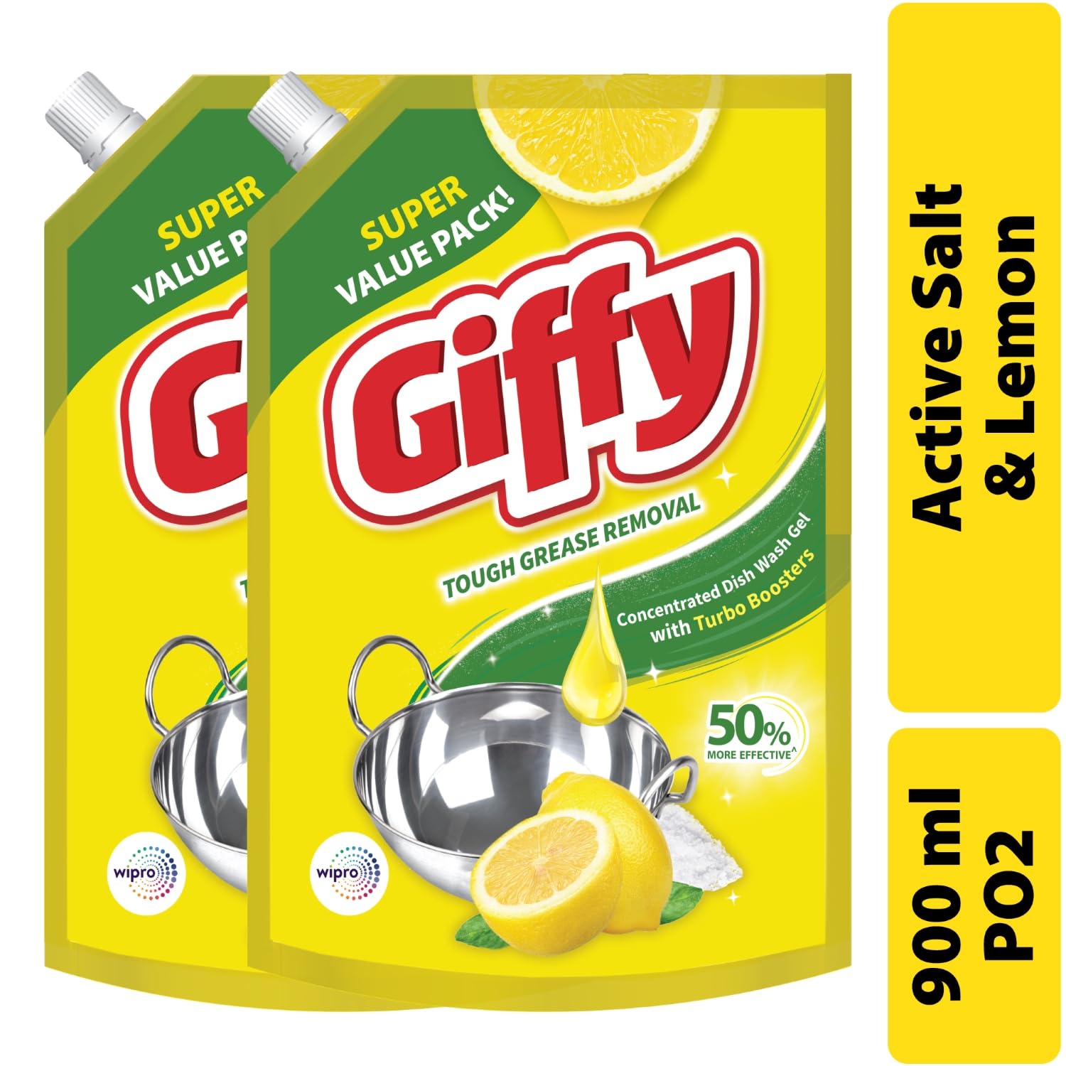 Giffy Liquid Dish Wash Gel 900ml Pack of 2 with Active Salt & Lemon| 2x Faster Tough Grease Removal & Natural Fragrance| Removes Odour| Easy Lather & Rinse Off| Leaves No White Residues| Hand-Safe