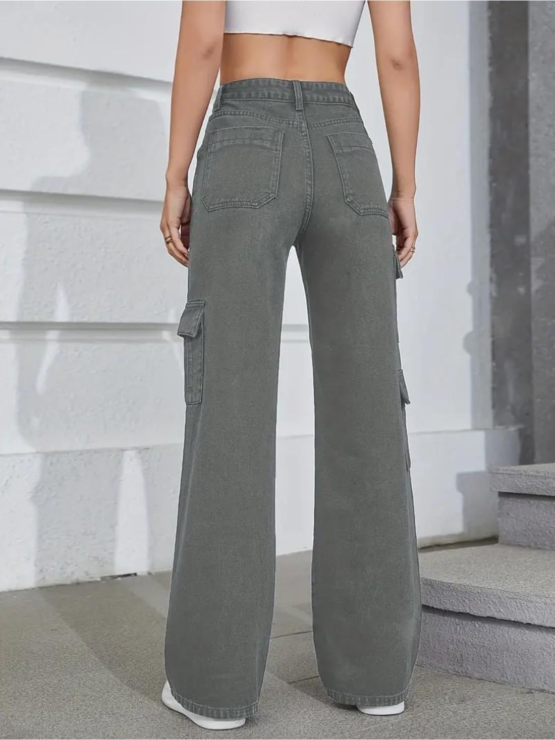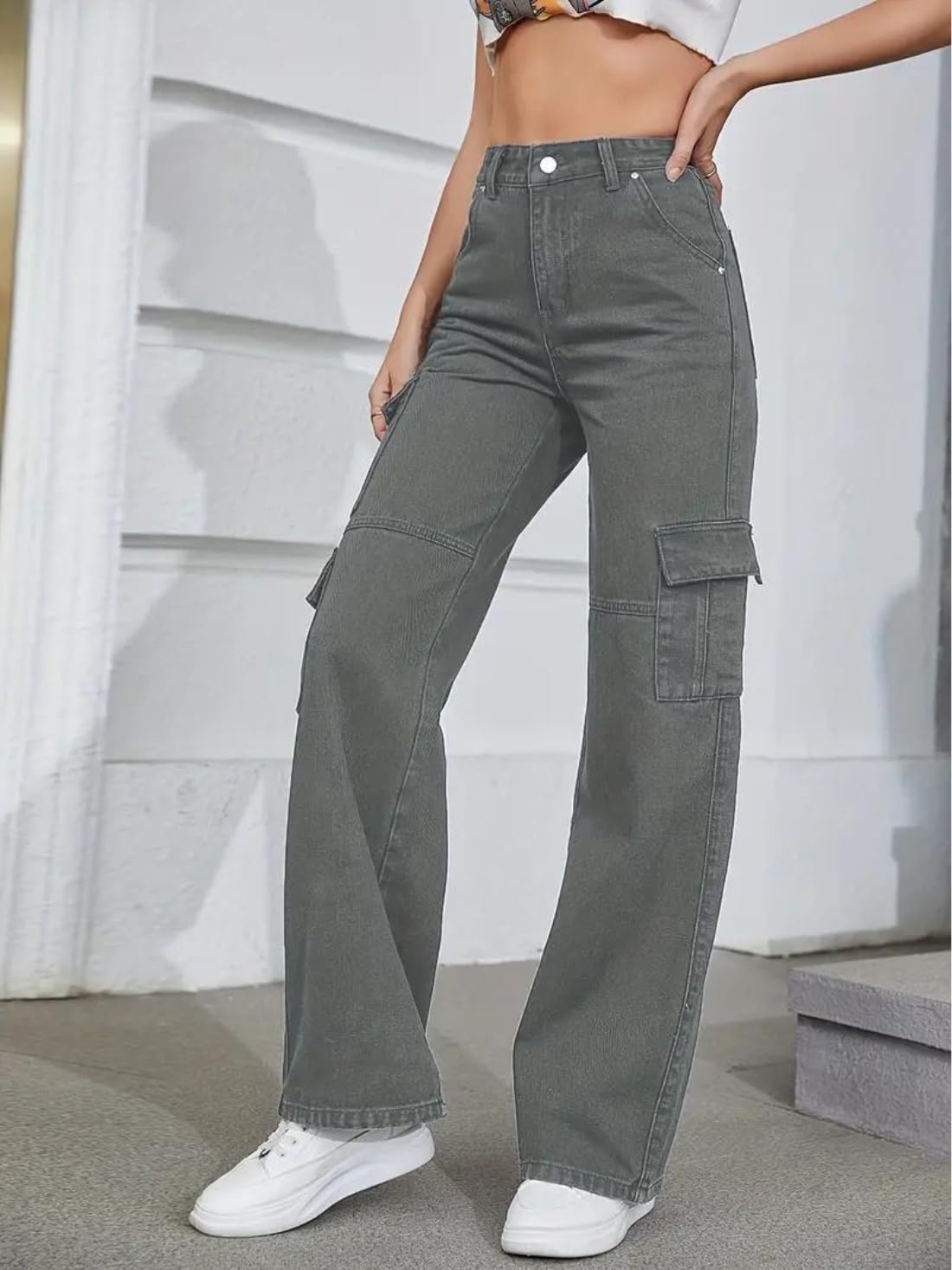 Glossia Fashion High Waist Cargo Denim Jeans for Women Wide Leg Stretchable Straight Fit Jeans(WJ1-1216)