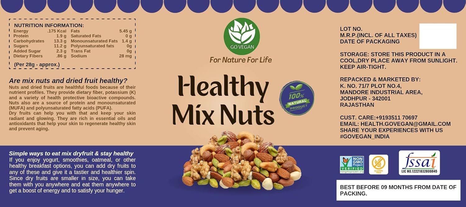 Review: I recently purchased the “Go Vegan” Healthy Mix Nuts and I am thoroughly impressed with both the quality of the nuts and the packaging they come in. The mix includes a variety of different nuts, including almonds, cashews, walnuts, and dried fruits and each one is of the highest quality. The nuts are fresh and flavorful, I love that the mix is vegan-friendly and contains no added preservatives or artificial flavors, making it a healthy snack option that I can feel good about eating.The packaging is also worth mentioning. The resealable container is sturdy and keeps the nuts fresh for a long time. I appreciate the clear labeling and the fact that the ingredients are clearly listed on the back of the box. It makes it easy to know exactly what I am consuming and the nutritional benefits I am receiving.Overall, I would highly recommend the “Go Vegan” Healthy Mix Nuts to anyone looking for a delicious and healthy snack option. The quality of the nuts and the thoughtful packaging make it a standout product that I will definitely be purchasing again in the future.