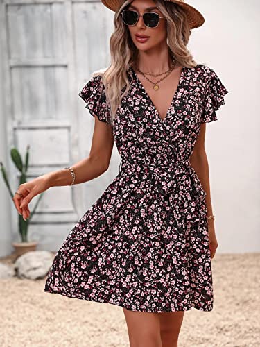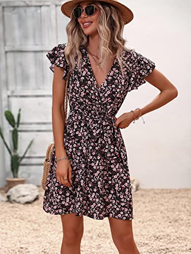 GRECIILOOKS Women Western Dress Floral Print Wrap V Neck Dress& Ruffle Sleeve with Mini Summer Short DressDress for Vacation Outdoor Wear Dress