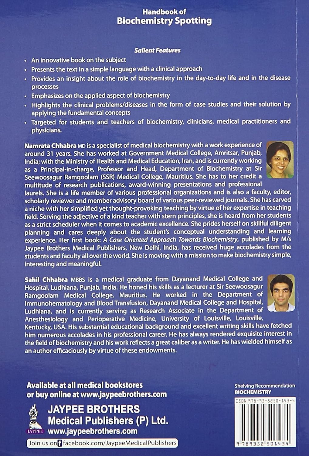 • An innovative book on the subject • Presents the text in a simple language with a clinical approach • Provides an insight about the role of biochemistry in the day-to-day life and in the disease processes • Emphasizes on the applied aspect of biochemistry • Highlights the clinical problems/ diseases in the form of case studies and their solution by applying the fundamental concepts.