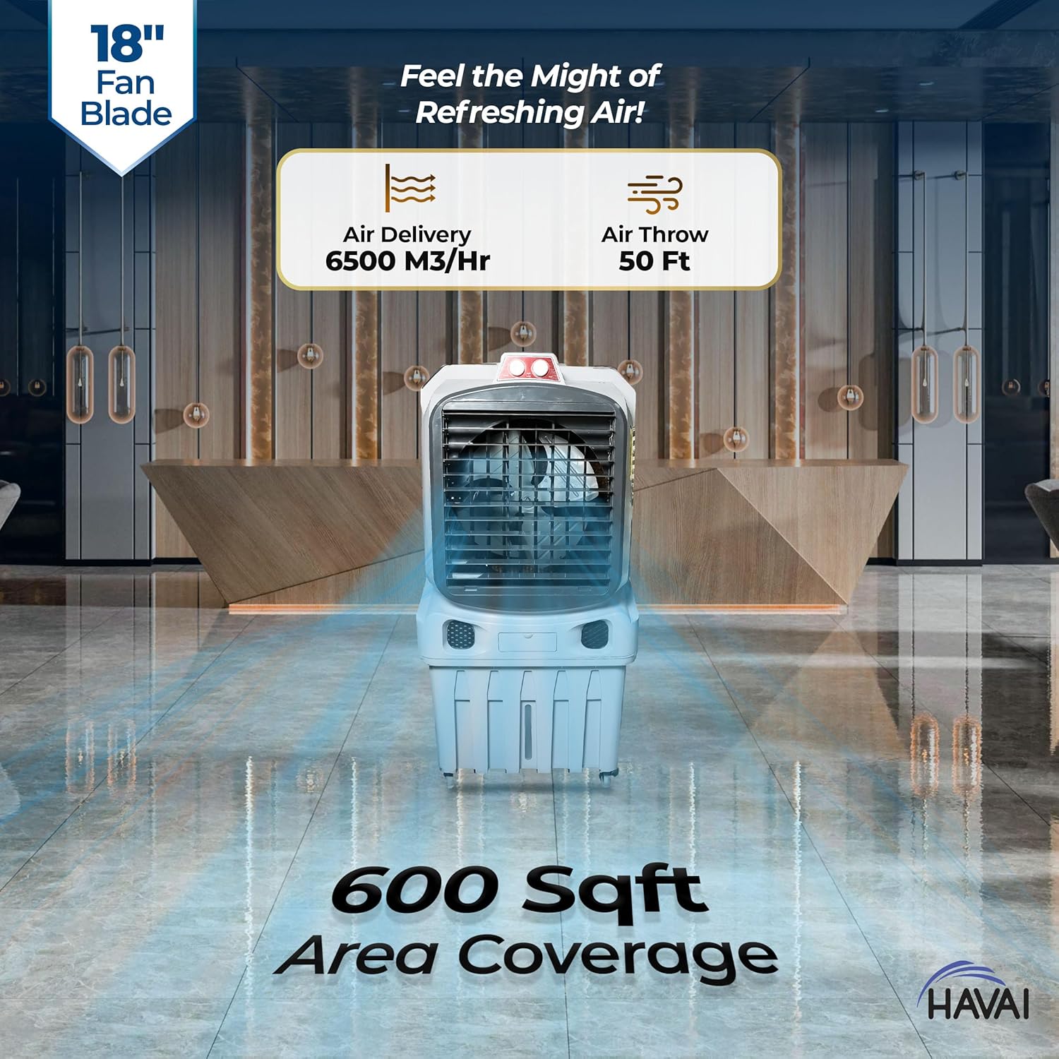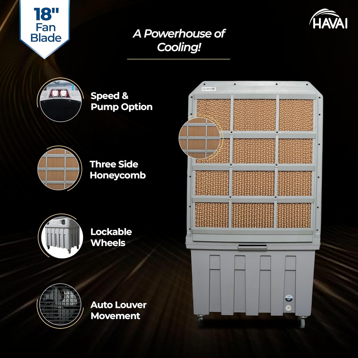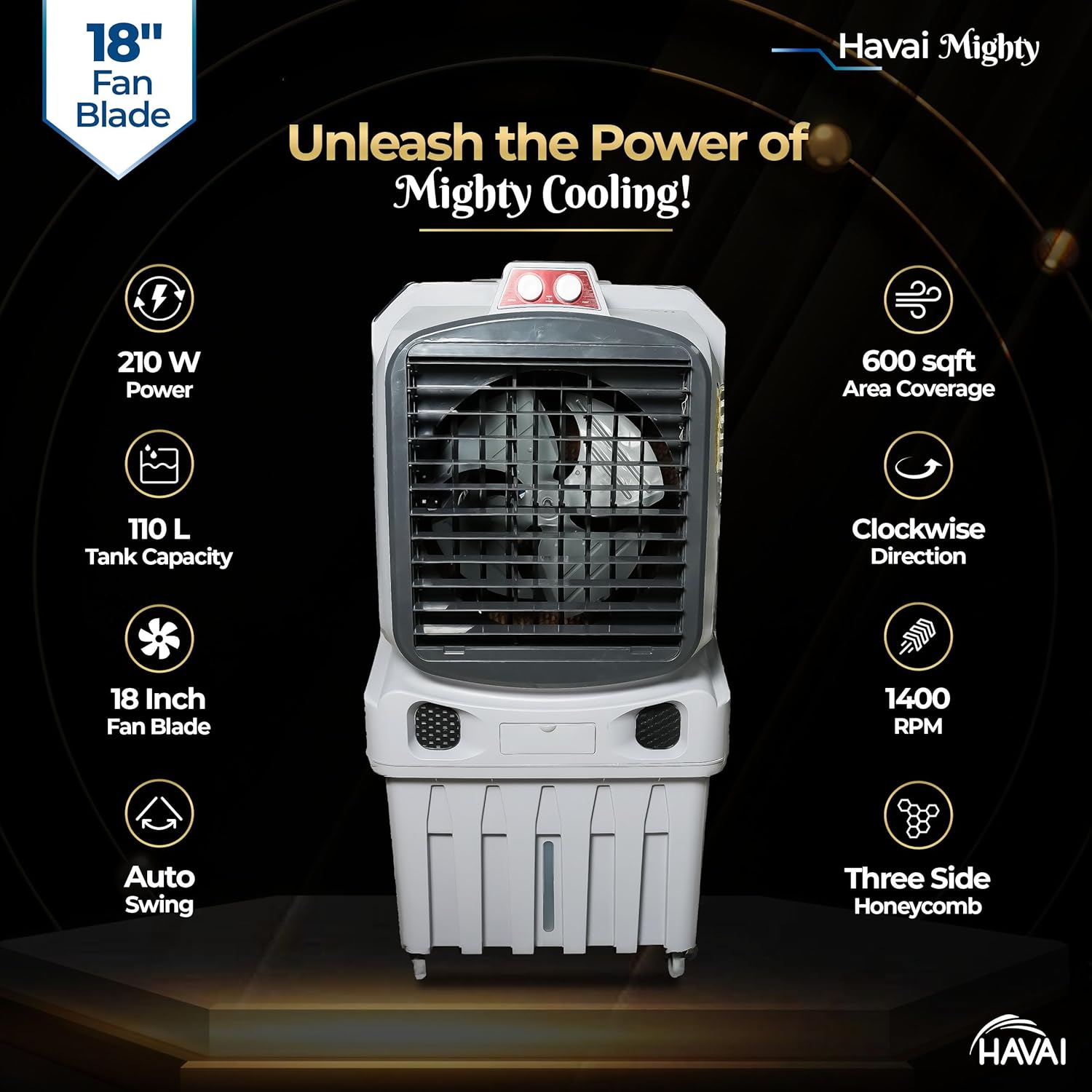 Havai Mighty 18″ Air Cooler | 18 Inch Blade | 110L Tank Capacity | 210W Power | 600 Sqft Coverage | Auto Swing | Three-Side Honeycomb | Clockwise | Lockable Wheels