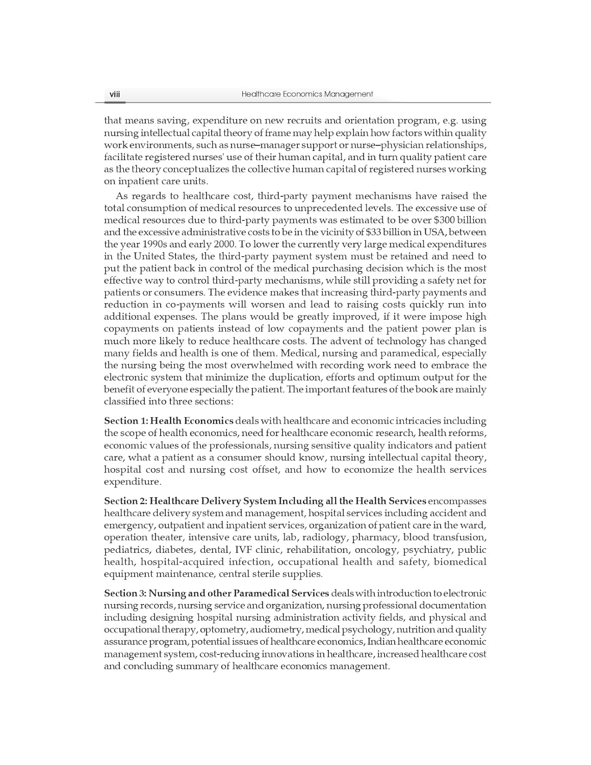 Section 3 deals with an introduction to nursing records, nursing service and organization, nursing professional documentation including designing hospital nursing administration activity fields, and physical and occupational therapies, optometry, audiometric, medical psychology, nutrition and quality assurance program, potential issues of healthcare economics, Indian healthcare economic management system, costreducing innovations in healthcare, increased healthcare cost, concluding the summary of healthcare economic management and Annexures in the end support by health economics terminology definitions, the definition of medical specialties, medical terms used in healthcare management, standardized medical abbreviations with single meaning and bibliography.